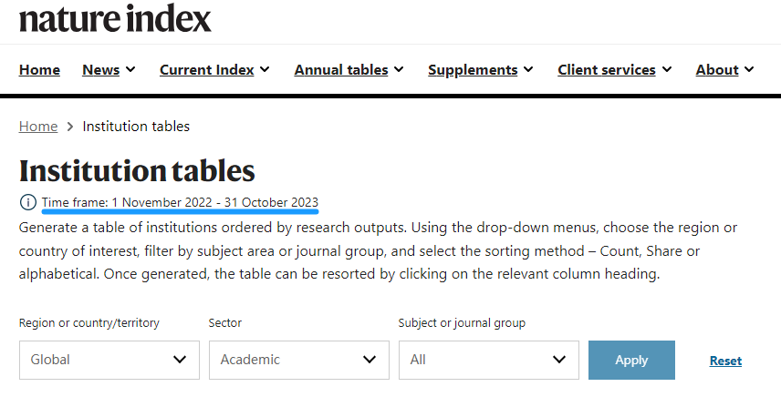 自然指数(Nature Index)于2014年11月首次发布,是依托于全球顶级期刊(《自然》系列、《科学》《细胞》、医学等145种期刊),统计各高校、科研院所(国家)在国际上最具影响力的研究型学术期刊上发表论文数量的数据库。运用这个数据库,可以根据各机构的论文发表数量及类别来进行排名和期刊索引。目前,自然指数已发展成为国际公认的能够衡量机构、国家和地区在自然科学领域的高质量研究产出与合作情况的重要指标,在全球范围内有较大影响力。