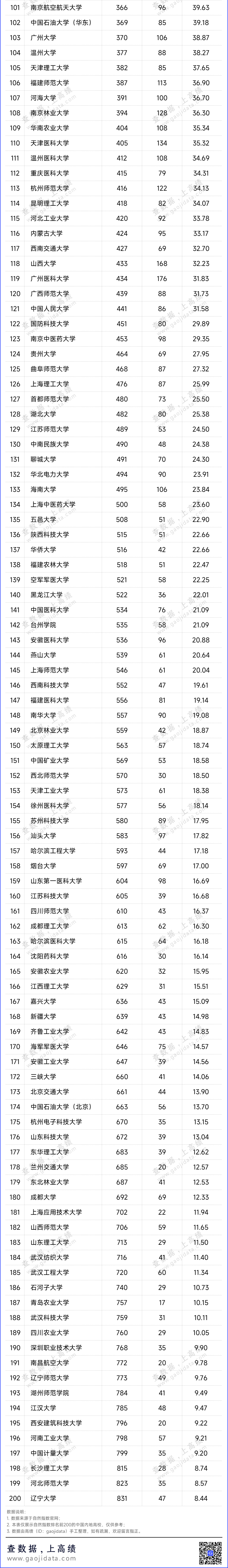 2024最新自然指数排名中国内地高校TOP200名单(2022.11.1-2023.10.31)如下: