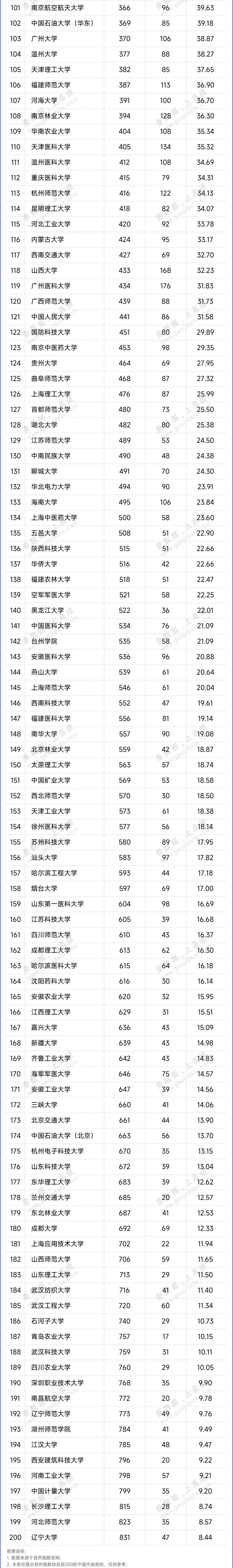 2024最新自然指数排名中国内地高校TOP200名单(2022.11.1-2023.10.31)如下: