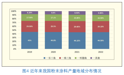 2022年长三角地区占44.5%左右,仍然占主导地位;珠三角地区占比29.1%左右,产量主要集中在广东省,以建材和家电为主;环渤海地区占比16.5%,不断下滑;中西部地区粉末涂料占比9.9%,呈逐步上升态势(图4)。