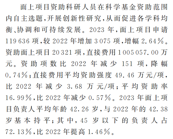 2023年,国家自然科学基金委员会共接收各类项目申请316982项,比2022年(306939项)增加3.27%,增幅较2022年的6.83%有所降低。其中,在项目申请集中接收期间,共接收2400个依托单位提交的13类项目申请304333项,同比增加9937项,增幅为3.38%。全年共受理项目申请315497项;对1485项项目申请不予受理。经过评审和审批程序,2023年度共批准资助各类项目52547项,经费合计3187901.38万元。