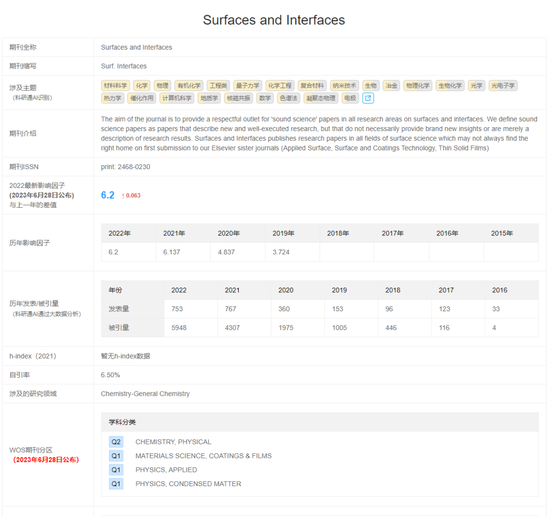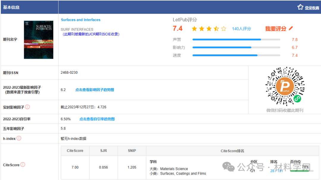 今天向大家介绍一篇近期发表在《Surfaces and Interfaces》杂志上的研究文章,该杂志是材料科学领域的一区期刊。这篇文章的通讯作者是来自中国地质大学材料科学与工程学院的 Yangai Liu 教授。文章在3月份已经在线发表。
