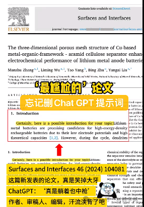 不得不说这个感觉就很熟悉了,如果你经常与ChatGPT交流,你会注意到它的回复总是彬彬有礼,这一点让人印象深刻。上个月有人报道过发表在水刊上的论文使用 MidJourney 生成图片,但这篇文章发表的期刊 Surfaces and Interfaces 是中科院一区期刊,最新影响因子6.2。