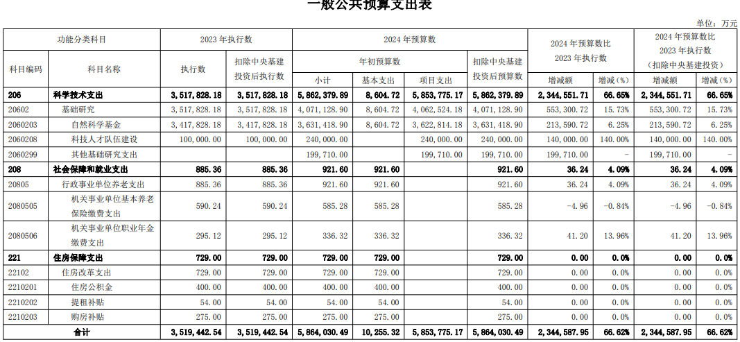 国家自然科学基金委员会网站公布《2024年度部门预算》,今年自然科学基金项目预算数有较大增长,比2023年执行数增加213590.72万元,增长6.25%,创下新高。