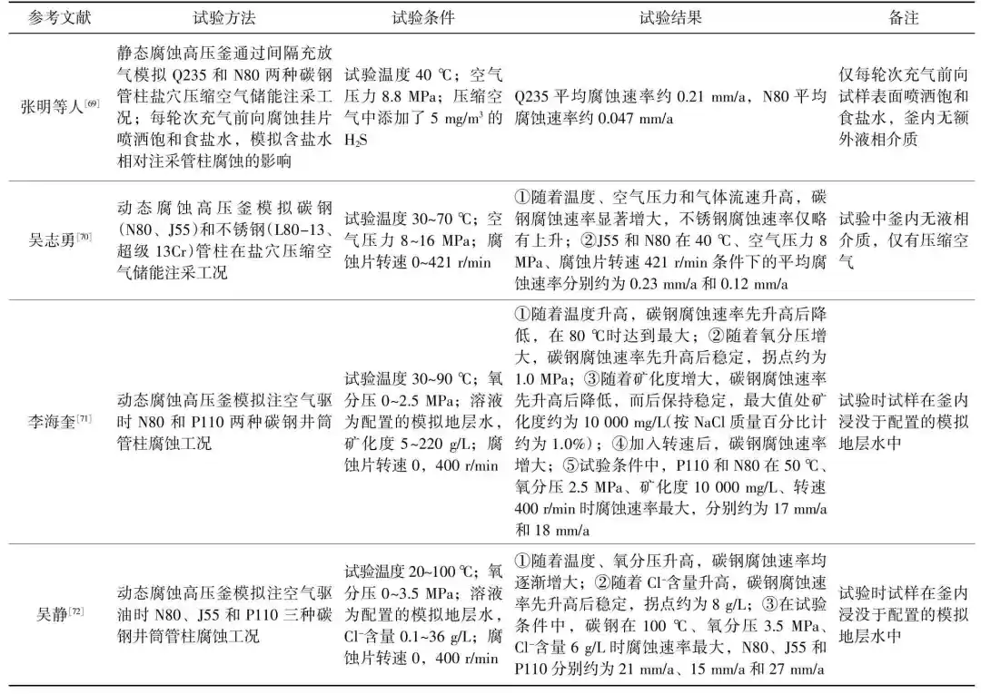 表13 盐穴压缩空气储能工况和注空气驱油工况管柱腐蚀研究结果统计(部分)