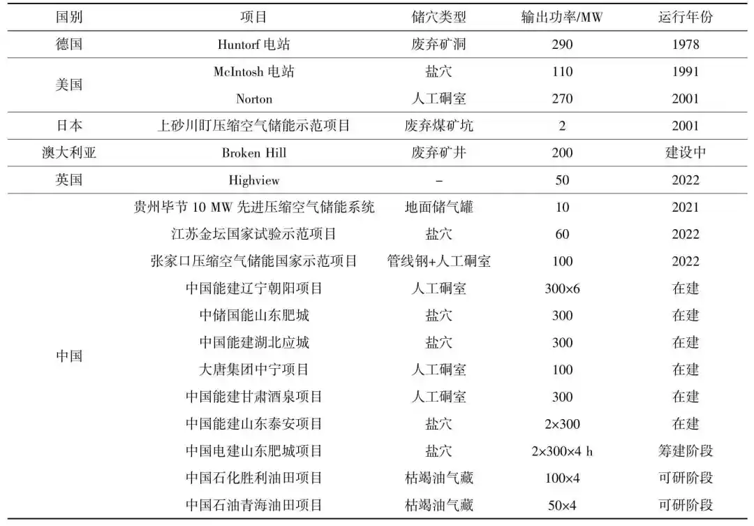 压缩空气储能是指利用风、光等波动性电力以及在电网负荷低谷期的剩余电力将空气压缩至储气容器中形成高压气体,待到用电高峰时再将高压气体释放并通过透平发电,从而提升电网调节能力和新能源消纳能力的技术。压缩空气储能的储气方式主要有盐穴、人造硐室、地面储气罐、废弃矿洞等,表12列出了国内外部分压缩空气储能项目建设情况,其中盐穴压缩空气储能因其建设成本低、周期短、资源丰富等优势,近年来在国内发展迅速。