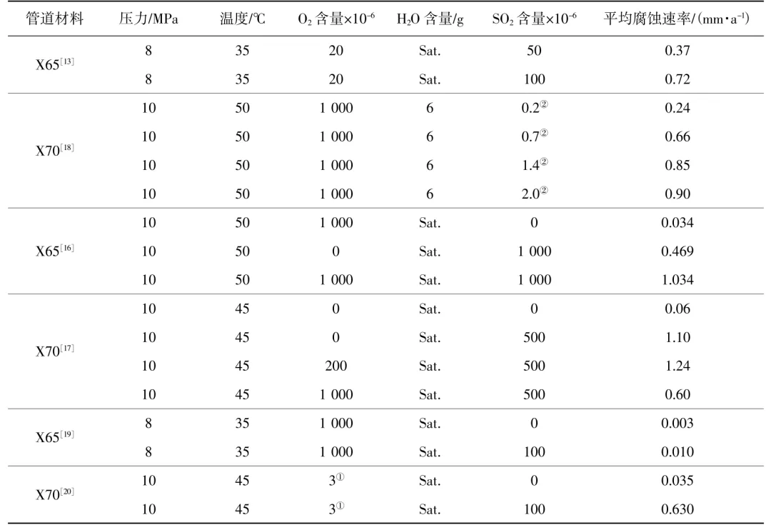 表3 杂质气体SO2对超临界CO2输送管线腐蚀影响的研究结果统计
