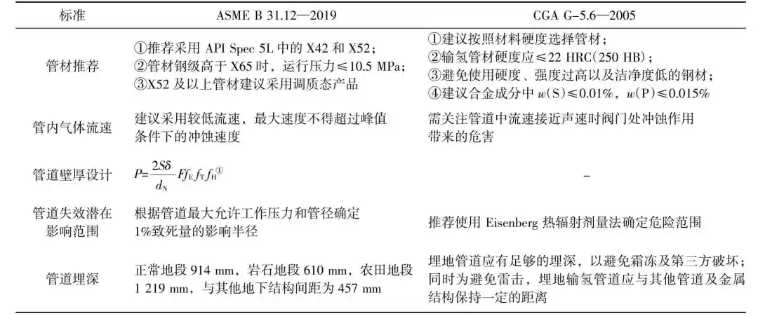 迄今国外关于氢气输送管道相关标准有欧洲标准CGA G-5.6—2005《Hydrogen Pipeline Systems》、美国标准ASME B 31.12—2019《Hydrogen Piping and Pipelines》和亚洲标准AIG A 033/14—2014《Hydrogen Pipeline Systems》,国内暂无氢气输送管道专用标准。上述标准对管道的材质性能、运行压力、建设安全性等方面作出相关建议和要求,输氢管道常用材质牌号(钢级)及其强度要求如表11所示。