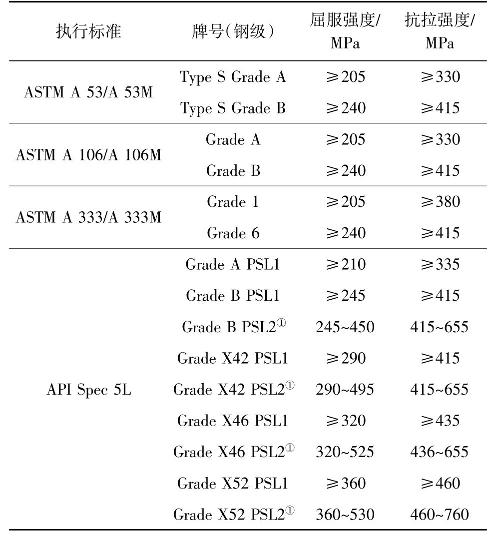 表11 输氢管道常用材质牌号(钢级)及其强度要求
