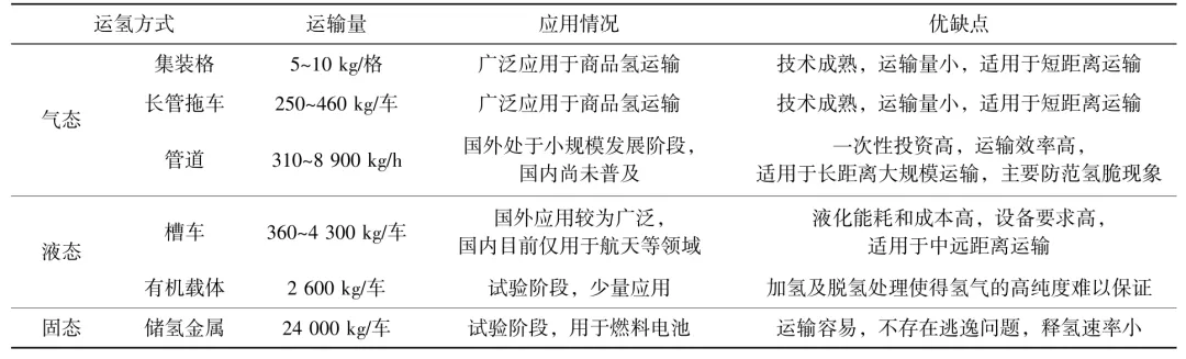 按照输送介质相态可将运氢方式分为气态、液态和固态3种,氢气输送方式对比见表5,目前气态储运氢应用最为广泛。气态储运氢可采用储气瓶、长管拖车和管道等方式,然而储气瓶和长管拖车运输能力有限、成本高,难以支撑氢能大规模应用需求,因此发展管道输氢是必然选择。