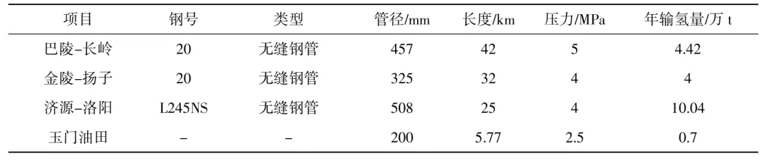 表6列出了国外部分纯氢输送管道运行情况,已建输氢管道用材质普遍为低钢级的碳钢和低合金钢焊管或无缝管,超短距离输送压力最高达14 MPa,长距离输送压力普遍在10 MPa以下,大部分集中在3~5 MPa。