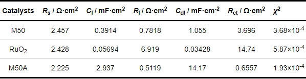 电极的导电性影响电极材料在催化过程中的电荷转移能力。为了更好地分析M50和M50A电催化电极的电荷转移能力,在105~0.01 Hz的频率范围内对M50、RuO2和M50A在1.58 V (vs. RHE)下进行电化学阻抗谱(EIS)测试,结果如图7d所示。在低频处没有观察到Warburg 阻抗,表明在此电位下的OER过程只由电荷转移过程控制。图7d中的插图给出了一个简单的等效电路模型(EET)用于拟合EIS数据,其中Rsol、Rf、Cf、Rct和Cdl分别表示电解液的电阻、催化剂电阻、催化剂电容、电荷转移电阻和双电层电容,其中催化剂电阻和电容是电极表面粗糙度、自身导电性和氧化膜等因素使电场不均匀引起的。所有这些电路元件都是将等效电路拟合到阻抗图估算的,并在表2中列出。如表2所示,M50、RuO2和M50A的电荷转移电阻分别为3.696、14.74和0.6557 Ω·cm2。这表明,不同电极双电层电容Cdl大小的规律与非法拉第区测量循环伏安曲线得到的双电层电容大小规律一致。由于电极表面较为粗糙,这一结果误差较大,因此本文不采用这一拟合数据评判电极的电催化活性面积。对于M50和M50A电催化电极,无论内部催化剂电阻还是界面处的电荷转移电阻,其数量级相同,表明具有良好的电荷转移能力。这一结果,与负载型催化剂或者复合电极相比,电荷转移能力的优势较为明显。χ2表示EIS图中EET电路的拟合优度,其数量级为10-4,表明选择的拟合电路具有良好且合理的电荷转移能力。催化剂的长时间稳定性表征其是否具有实用性。在电流密度分别为10和50 mA·cm-2的条件下测试了M50A进行长达50 h的稳定性,结果表明,工作电压没有明显的上升,表明M50A电催化电极在碱性溶液环境下具有优异的析氧性能稳定性。