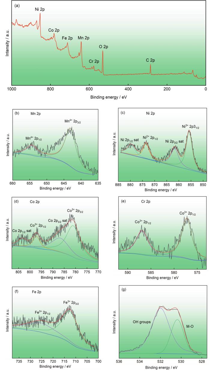 对电催化析氧反应后的M50A电极表面进行XPS分析,以进一步了解电催化析氧过程。图8a给出了电极表面的XPS全谱,可见存在Mn、Fe、Co、Cr、Ni和O。(图8b)中的Mn 2p谱对应结合能624.7和654.7 eV的峰,表明存在MnO2 [35]。Ni的高分辨XPS谱中的各峰分别为结合能855.8、863和873.1 eV的特征峰,表明存在Ni3+,与文献中的NiOOH的特征峰位置一致[36,37]。在Co的2p谱图中出现了位于781和797.5 eV的特征峰并伴有分别位于787.5 和803 eV的Co2p3/2和Co2p1/2卫星峰。这表明,Co在反应后以CoOOH形式的存在,而不是以金属氧化物形式[38]。对Cr 2p谱图的分析结果证实,位于576.8和586.7 eV的特征峰属于Cr2O3[39, 40]。在图8f的Fe2p谱图中Fe2p3/2和Fe2p1/2峰的结合能分别位于711.5和727 eV,表明Fe在催化剂反应过程中以FeOOH形式存在[39]。对图8g中的O 1s的谱图分析表明,催化剂反应后其表面主要由的金属氧化物(M-O)和金属氢氧化物(M-OH)组成,其中氢氧化物的含量高于金属氧化物的含量,说明M50A催化剂在催化过程中的活性物质为金属的氢氧化物。