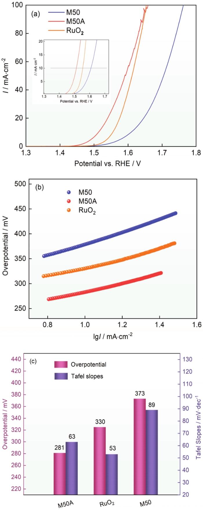 (2)与负载型析氧催化剂相比,在自支撑型电极结构的M50A电极材料中不存在因负载催化剂与载体之间功函数的差异而使界面电子转移受阻,从而提高了M50A电极材料在电催化过程中导电性,电荷转移能力更强有利于提高电极的电催化性能。