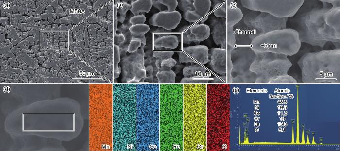 图2a给出了M50合金光滑表面的形貌。M50合金是单相FCC固溶体。为了确定表面的元素分布,对M50合金金相腐蚀后进行EDS分析,结果如图2b所示,可见M50合金表面的Mn和Ni有不同程度的偏析。对不同区域进一步进行EDS统计,得到枝晶和枝晶间的成分(图3)。从表1可见,枝晶的成分富Fe和Cr,枝晶间的成分富Mn和Ni。由于Mn和Cr、Fe的混合焓较大(分别为2和0 kJ/mol),在M50合金的快冷过程中容易被排挤出富含Cr、Fe的枝晶干区域;而Mn和Ni的混合焓为-8 kJ/mol,容易偏聚在枝晶间区域[33,34]。图4a给出了腐蚀后M50A催化剂的表面形貌,图4b~c给出了图4a中对应区域的放大图。可以看出,M50A的表面呈现多孔结构。图4d、e中的EDS面扫和能谱给出了M50A的成分,与表1中M50合金的枝晶成分相同。其原因是,在对M50化学腐蚀的过程中,枝晶内的成分富Cr和枝晶间成分富Mn使晶间偏析成分比枝晶内成分更容易腐蚀掉,因此在表面形成多孔结构。孔的直径约为5 μm,形成通道增大了比表面积,从而有利于提高电催化性能。