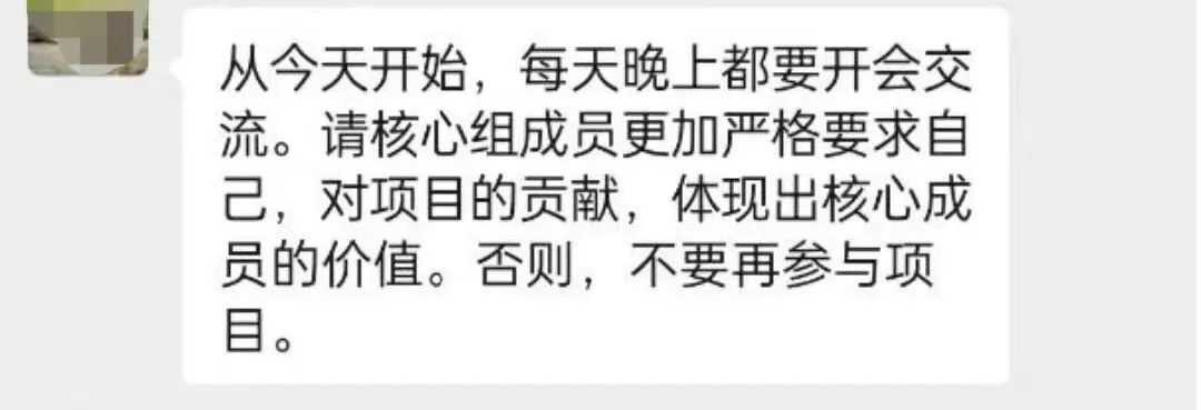 举报中还提到了郑某强迫学生加班,无视学生的身心健康。自 2024 年 2 月 11 日开始,郑某要求项目人员每天晚上七点半开会,汇报进展,每天开会的记录持续到 3 月 27 日。经视直播记者看到举报材料中,郑某与学生们的微信群聊记录“从今天开始,每天晚上都要开会交流,请核心组成员更加严格要求自己,对项目的贡献,体现出核心成员的价值。否则,不要再参与项目。”