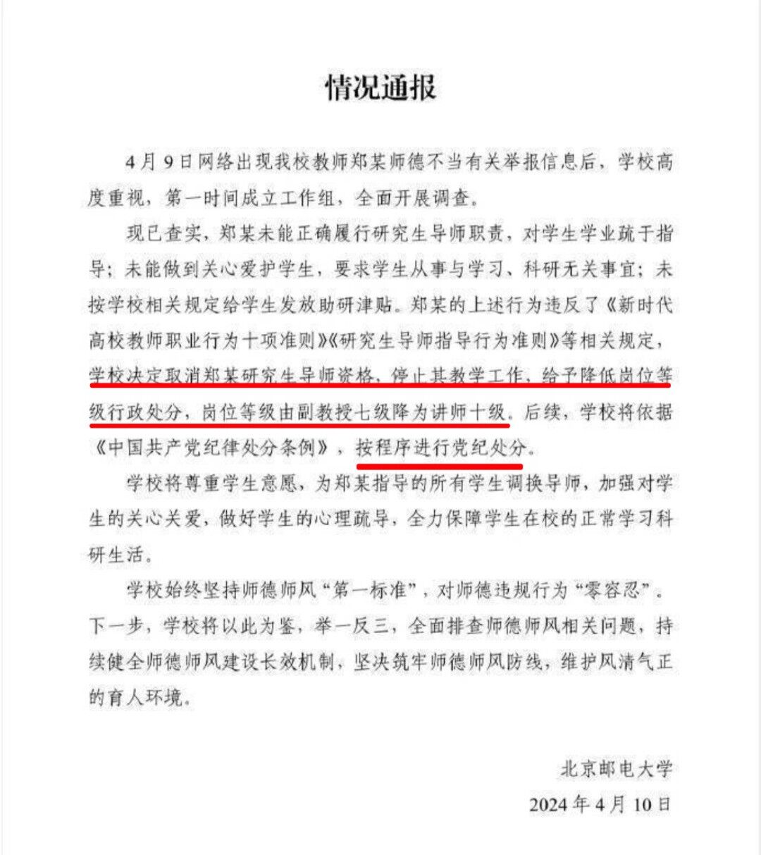 4月10日晚,@北京邮电大学 发布《关于我校教师郑某师德不当有关举报信息处理情况的通报》。学校决定取消郑某研究生导师资格,停止其教学工作,给予降低岗位等级行政处分,岗位等级由副教授七级降为讲师十级。后续,学校将依据《中国共产党纪律处分条例》,按程序进行党纪处分。学校将尊重学生意愿,为郑某指导的所有学生调换导师,加强对学生的关心关爱,做好学生的心理疏导,全力保障学生在校的正常学习科研生活。北京邮电大学(Beijing University of Posts and Telecommunications),简称北邮,位于北京市,是中华人民共和国教育部直属、工业和信息化部共建的全国重点大学,位列国家“双一流”建设高校、“211工程”、“985工程优势学科创新平台”,为北京高科大学联盟、中国人工智能教育联席会、CDIO工程教育联盟创始成员,入选国家“111计划”、“2011计划”、中国政府奖学金来华留学生接收院校、教育部第一批卓越工程师教育培养计划高校、国家建设高水平大学公派研究生项目、教育部首批“新工科”研究与实践项目、全国首批深化创新创业教育改革示范高校、一流网络安全学院建设示范项目高校、国家大学生文化素质教育基地、全国邮政行业人才培养基地。郑某是该校信息与通信工程学院的副教授、博士生导师,主要研究方向是无线通信、未来网络。