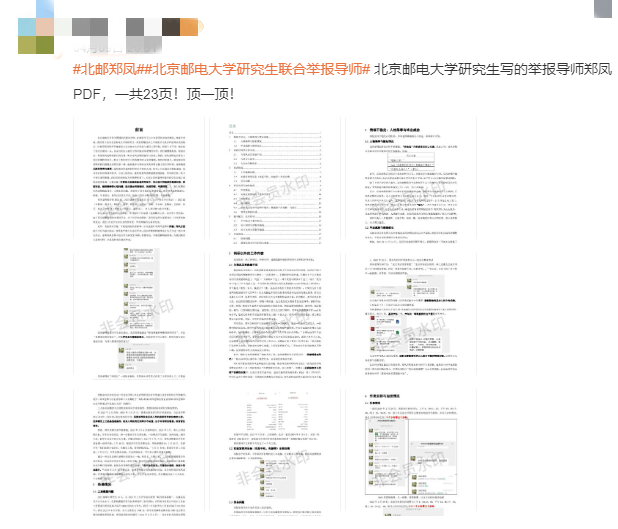 4月9日,话题 #北京邮电大学研究生联合举报导师# 引发网友热议。有网传文件显示,北京邮电大学信息与通信工程学院教师郑某被其指导的15名硕士研究生举报。网友晒出的内容显示, 北京邮电大学研究生写的举报导师郑某PDF,一共23页,引发关注。
