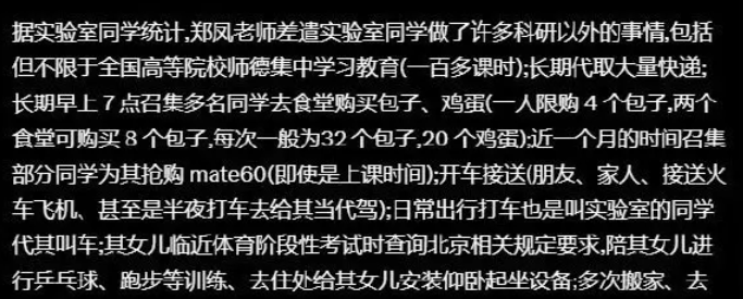 举报信息中称,“老师对我们就像是对待奴隶一样,越来越多与科研无关的事情占据了我们的时间,还伴随着无限的侮辱与谩骂。”网上公开信息显示,郑某,现为北京邮电大学副教授,在该校信息与通信工程学院工作。举报信息中称,郑某情绪极其不稳定,常常破口大骂,“你他妈”是其常挂嘴边的口头禅;郑某差遣实验室同学做了许多科研以外的事情,如长期代取大量快递,替其开车接送朋友、家人,去其家里打扫卫生;为其女儿做作业、接送上下学、在其女儿参加重要考试时代为作弊;多次帮其搬家、酒店开房;代其买花、养花,替其去商场退换货、维修等。