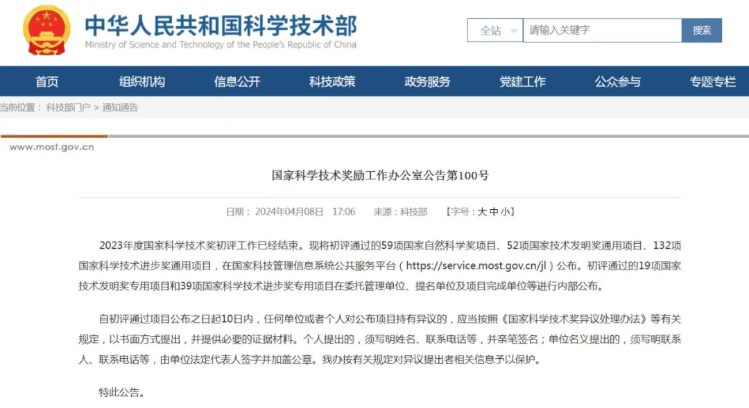 4月8日,科技部官网发布《国家科学技术奖励工作办公室公告第100号》,2023年度国家科学技术奖初评工作已经结束。现将初评通过的59项国家自然科学奖项目、52项国家技术发明奖通用项目、132项国家科学技术进步奖通用项目,在国家科技管理信息系统公共服务平台公布。