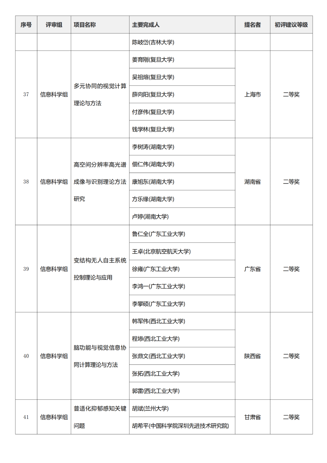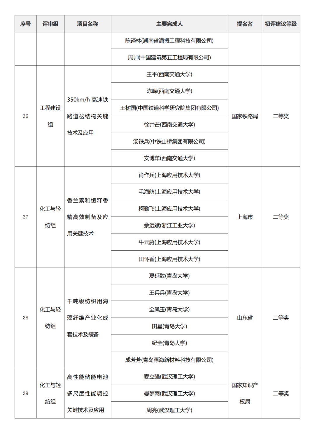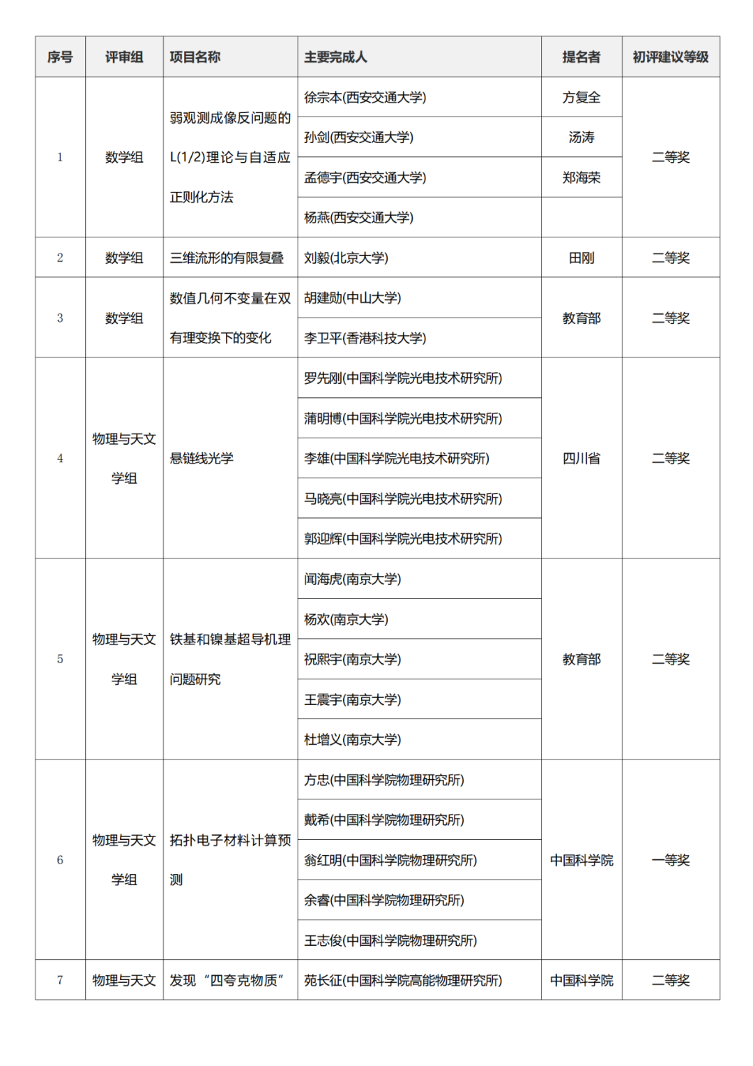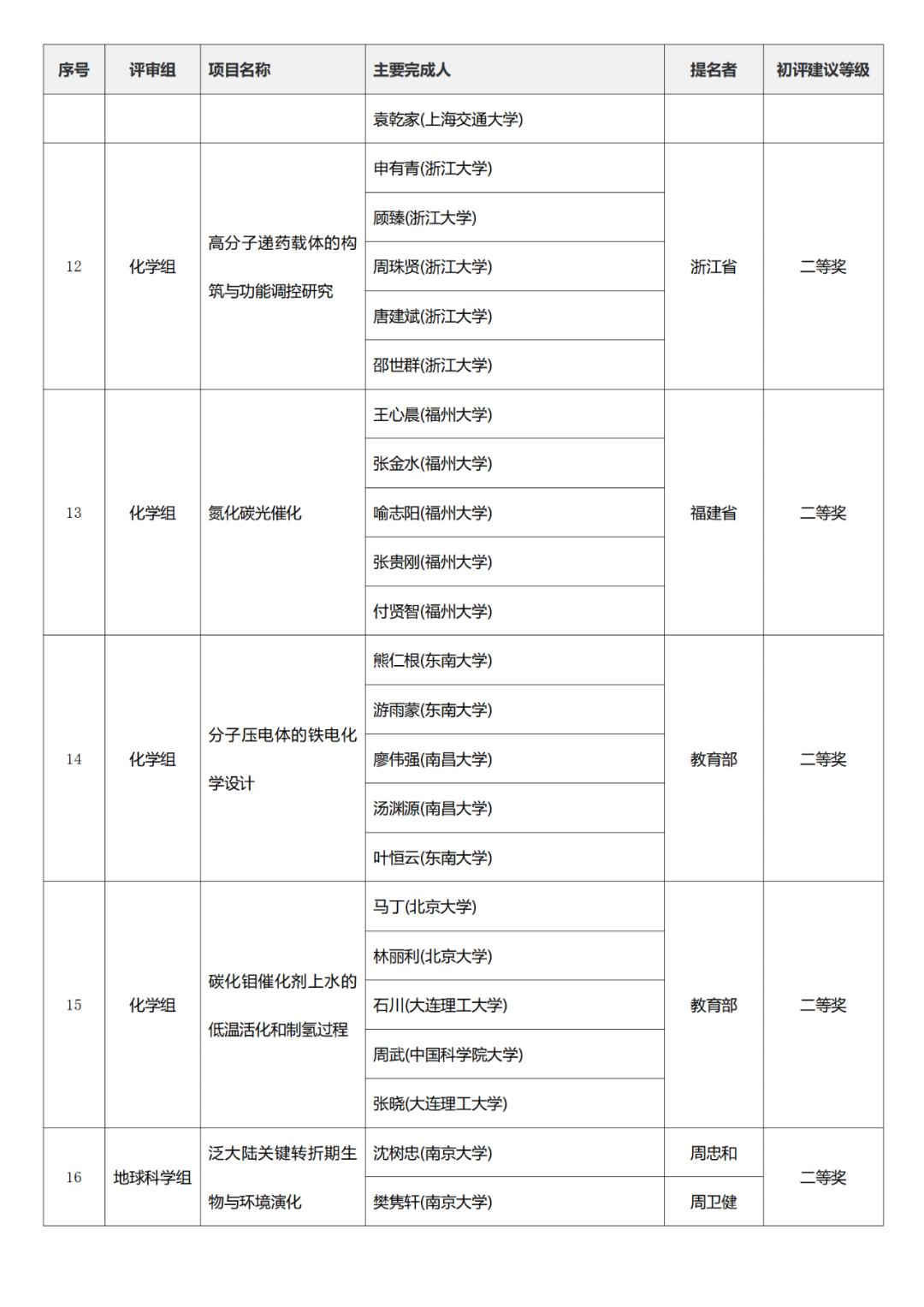 国家科学技术进步奖项目中,浙江工业大学、四川大学、上海交通大学、西安电子科技大学、清华大学、吉林农业大学初评建议等级获一等奖。