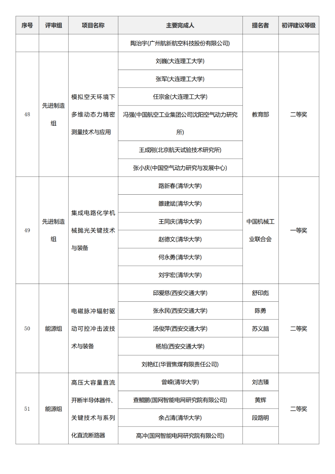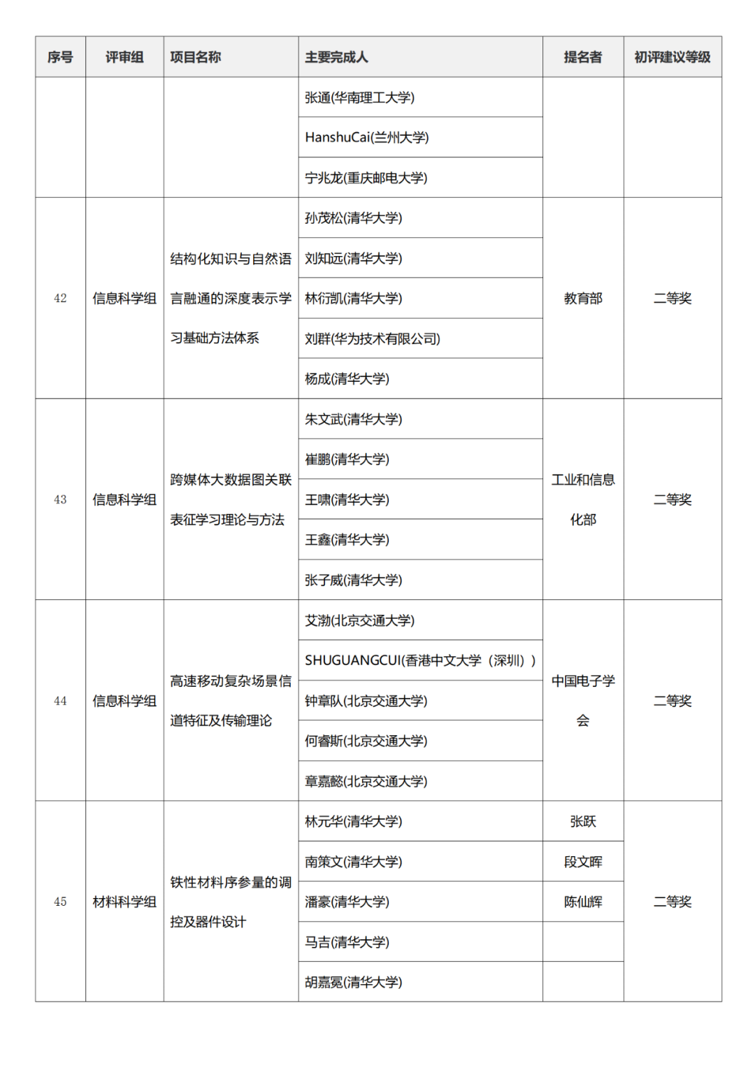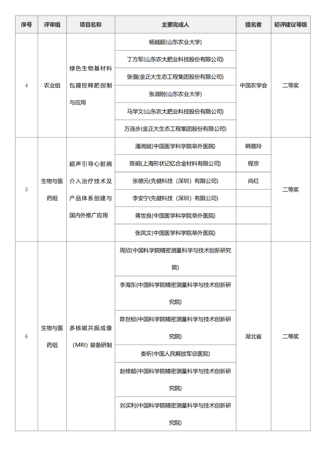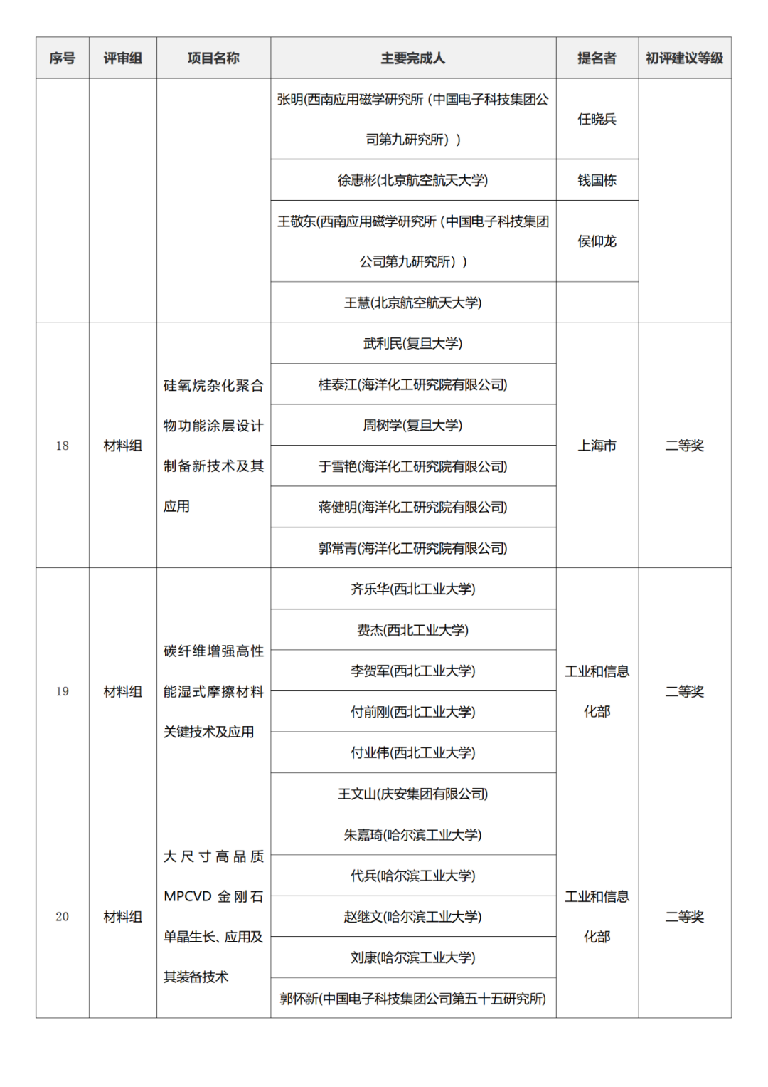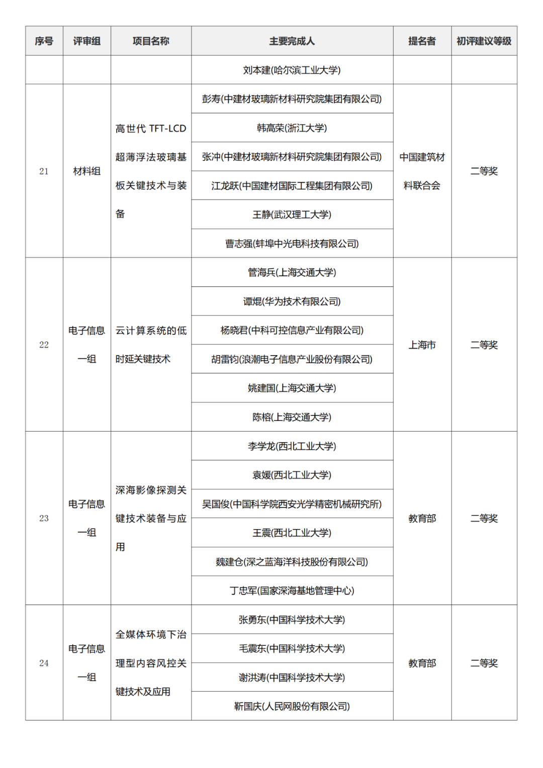 国家科学技术进步奖项目中,浙江工业大学、四川大学、上海交通大学、西安电子科技大学、清华大学、吉林农业大学初评建议等级获一等奖。