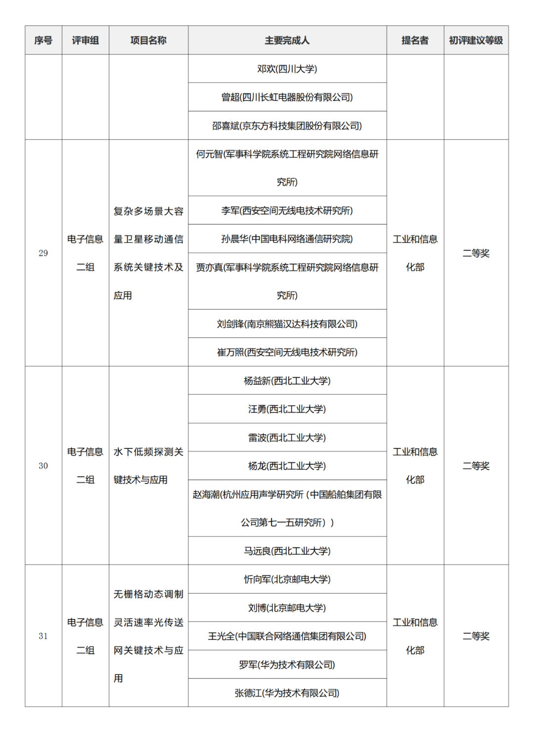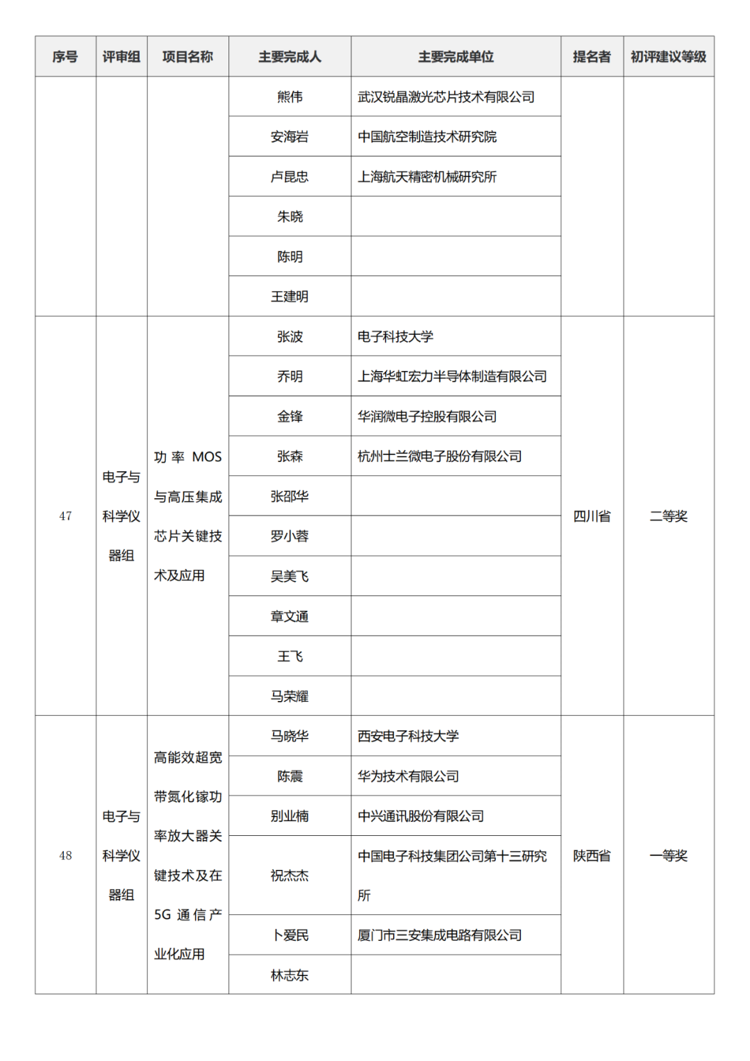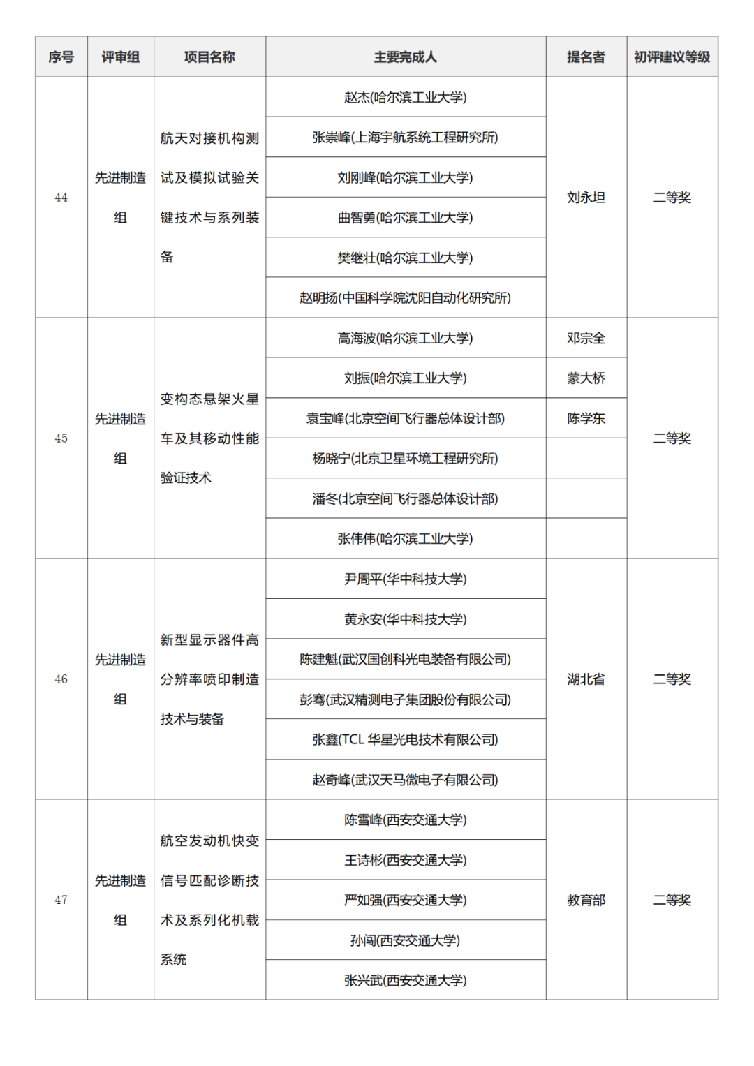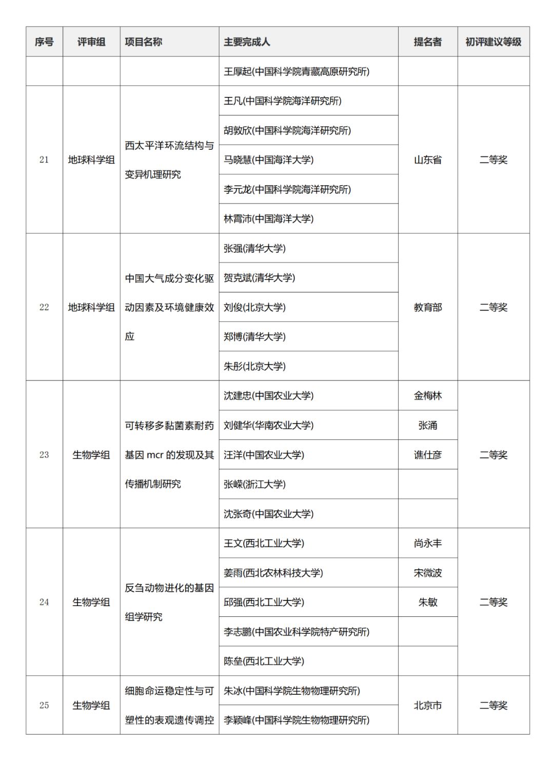 国家科学技术进步奖项目中,浙江工业大学、四川大学、上海交通大学、西安电子科技大学、清华大学、吉林农业大学初评建议等级获一等奖。