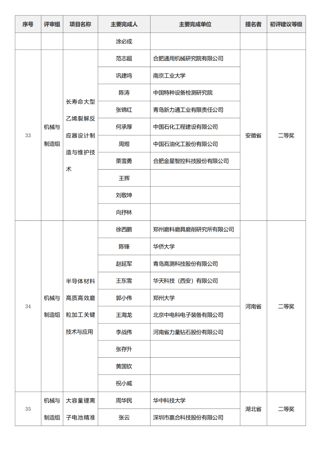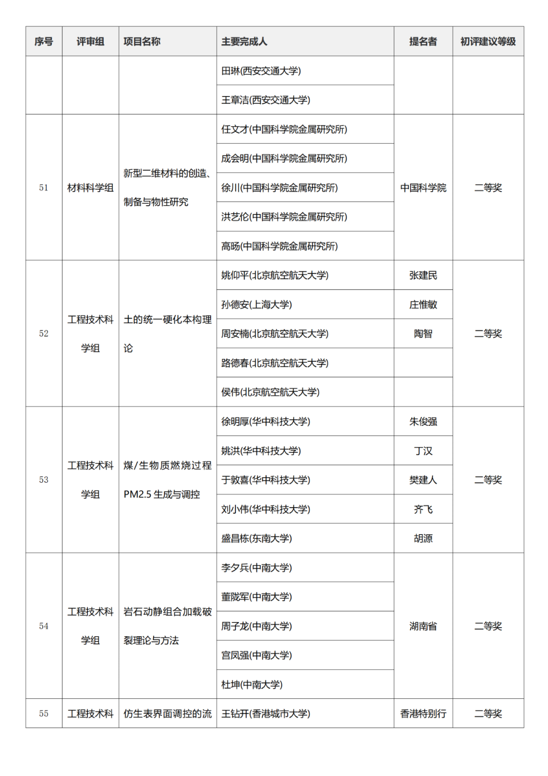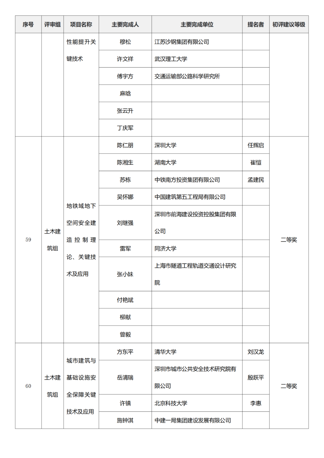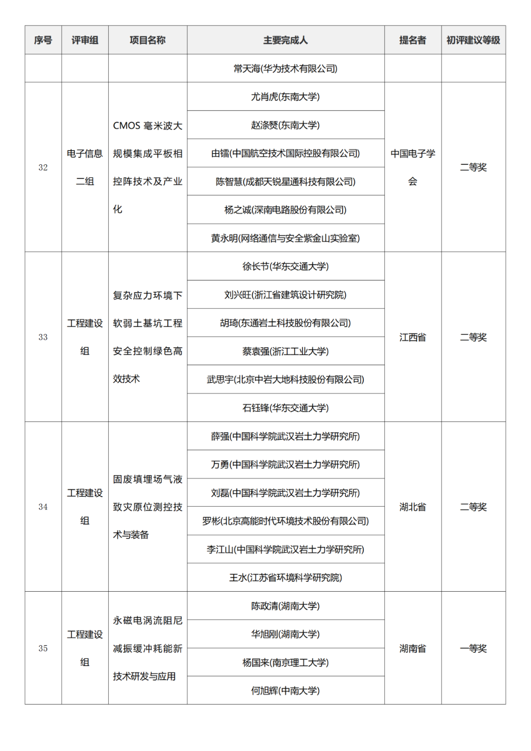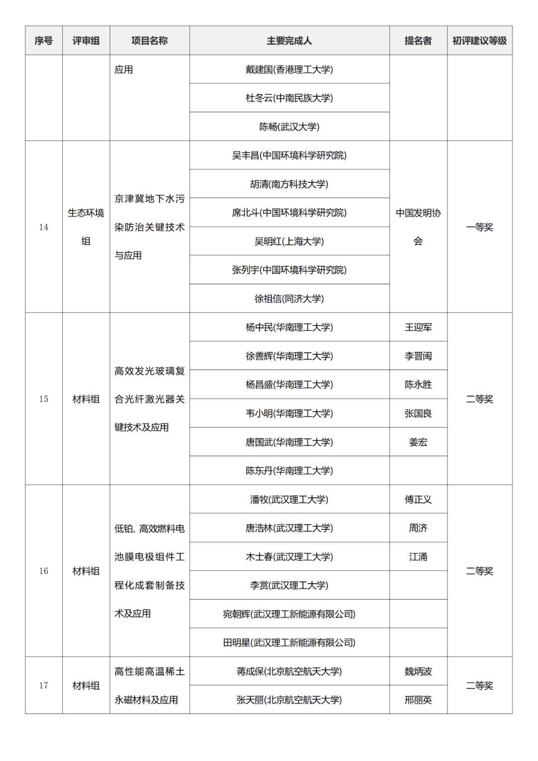 国家技术发明奖项目中,湖南大学、清华大学、中国矿业大学(北京)初评建议等级获一等奖。