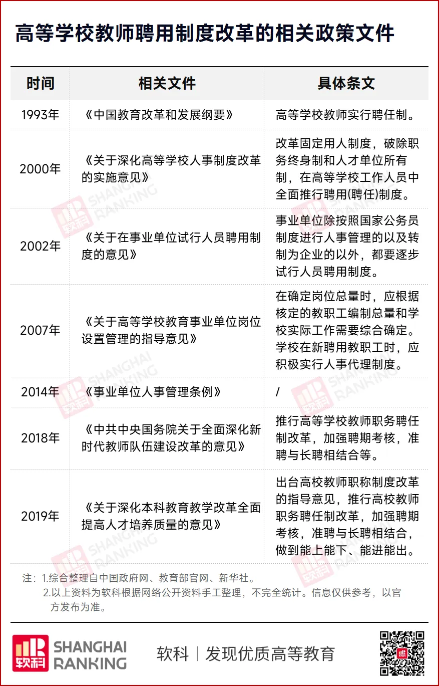 我国高校教师的聘用制其实一直都在演进。如下图所示,早在1993年《中国教育改革和发展纲要》就已经明确了高校教师实行聘任制。此后经过若干文件发布后的梳理,我们不难发现,顶层的设计是在聘任制的基础上加入更加灵活的人才聘用机制,破除终生制和人才单位所有制中的弊端,积极推动人事代理制的运用。