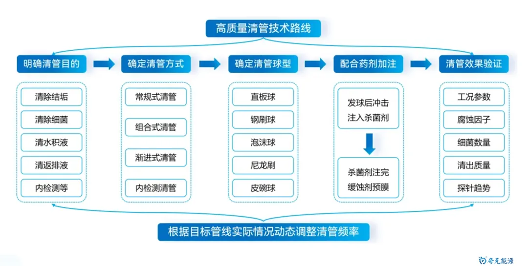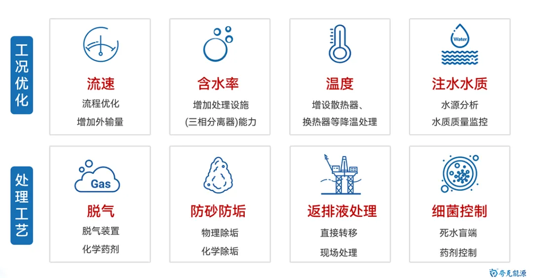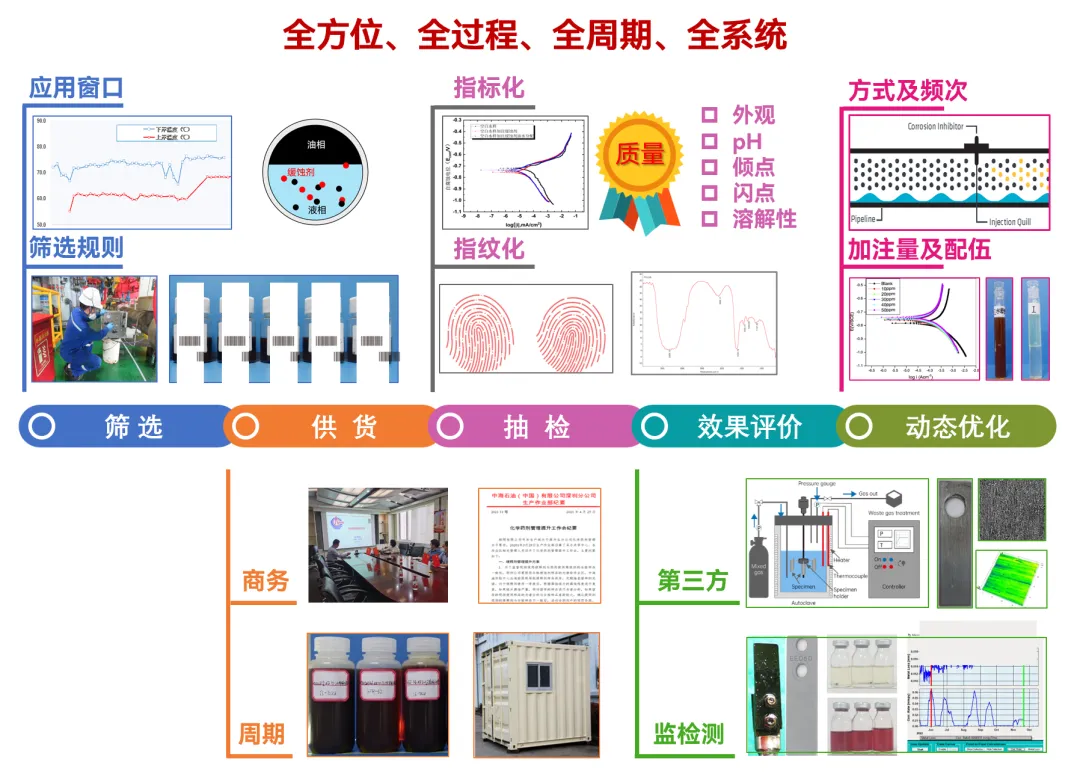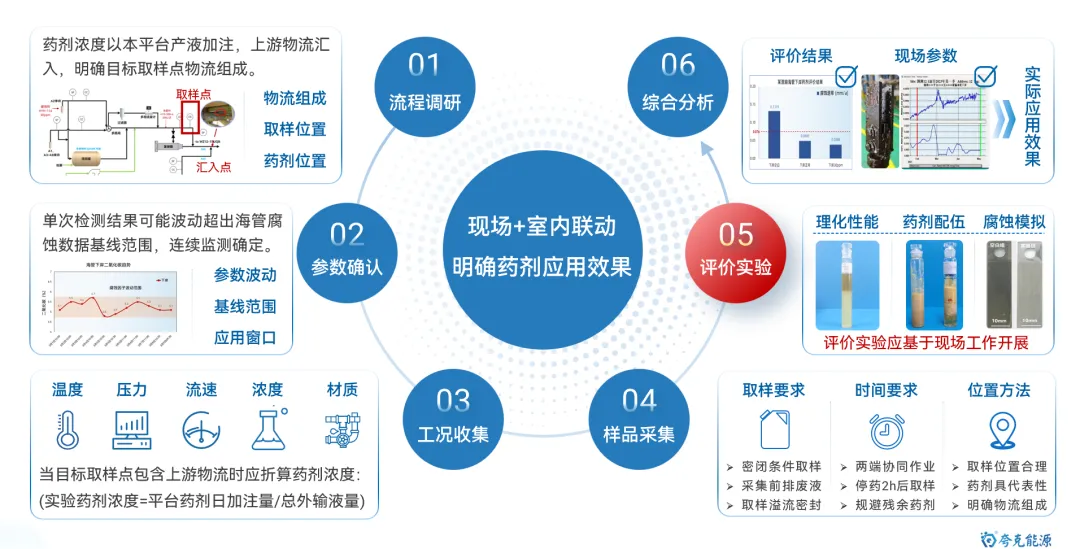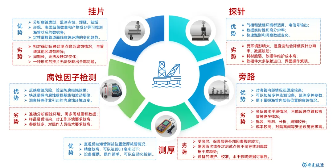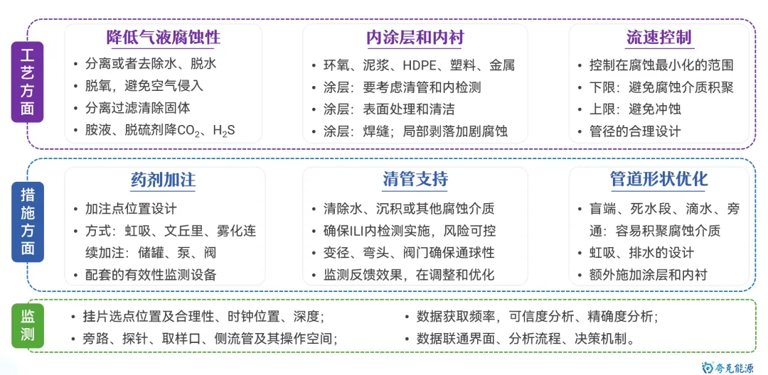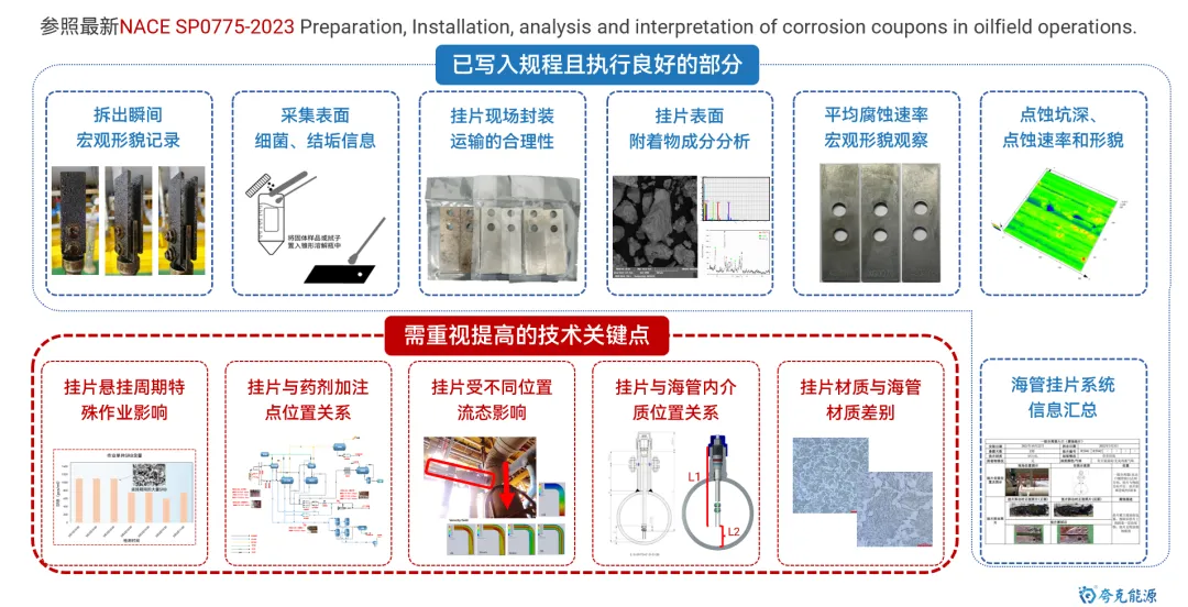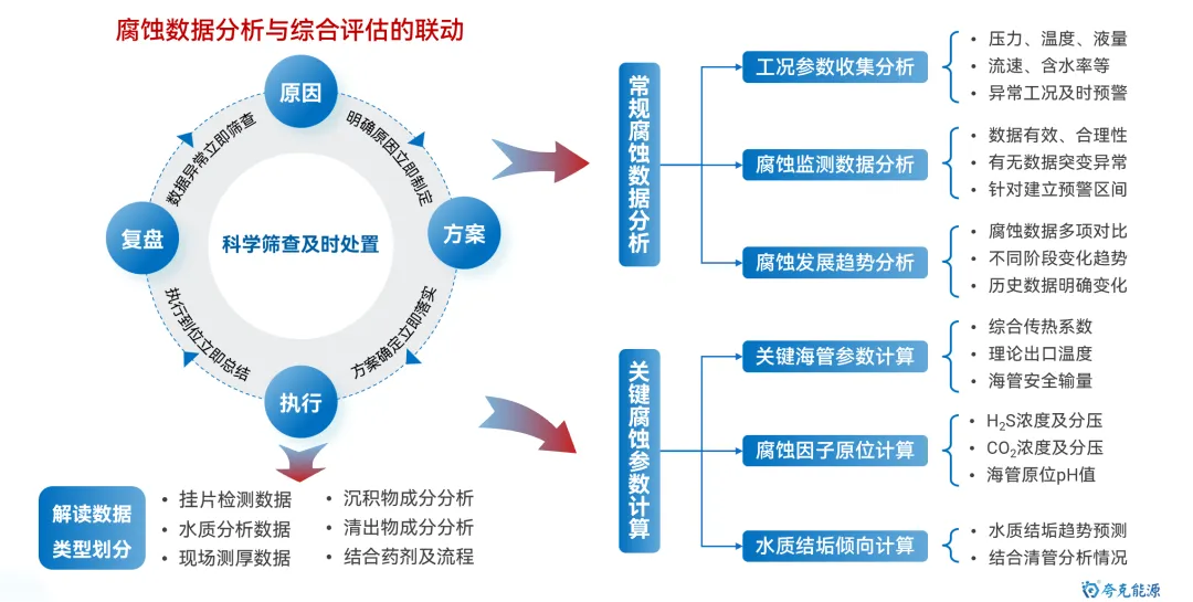 海底管道是海洋油气能源开发和运输的最重要动脉,保障其安全平稳运行极其重要。目前,随着海洋油气开发的深入,海管面临“新旧并存,含水差异、物流交汇、并联众多、介质干扰”的显著特点,管理难度逐渐增大。其中,内腐蚀是造成海底管道失效的最重要因素。 因此,如何通过数据收集客观反应腐蚀环境变化,并利用统计方法及数据分析手段,清晰掌握风险管控技术逻辑,制定更具针对性和精确性的管控措施,是管理方亟待解决的重要研究议题和技术攻关突破方向。 图1 海底管道内腐蚀管理面临挑战示意图 本文基于对海底管道内腐蚀管理的一些浅薄认识,梳理总结海底管道面临的内腐蚀风险,并尝试性地提出内腐蚀管控策略的相关思考和建议。内容如下: 一、内腐蚀风险类型概述 如前文《海底管道面临的内腐蚀风险概述》所述,海管内腐蚀主要类型如下图所示: 图2 海底管道内腐蚀风险类型示意图 CO2腐蚀 油气田最常见的腐蚀之一,同样pH下,CO2的总酸度比HCl高,会引起管道迅速的全面和局部腐蚀,最终造成失效。主要受到温度、压力、流速、pH值、介质组成、腐蚀产物膜等方面的影响。 H2S腐蚀 H2S溶于水中呈酸性,会造成管壁减薄或局部点蚀穿孔。主要受到材料因素、环境因素(浓度、pH值、温度、流速、Cl-)等方面的影响。研究表明微量H2S存在,对CO2腐蚀是有明显的抑制作用。 微生物腐蚀 油气田腐蚀管控难度较大的腐蚀类型,通过材料表面的生物膜中微生物的生命活动导致或促进材料腐蚀破坏多,多以布局点蚀为主。主要受到生物膜生产期、介质组分、砂垢形成的外部环境等方面的影响。 垢下腐蚀 一种金属表面沉积物形成的局部腐蚀,破坏性极大。当管道物流中携带淤泥、砂和固体颗粒形成沉积物。在与CO2、H2S、微生物等综合作用形成“大阴极、小阳极”的电偶效应,引发严重点蚀发生。主要受到固体颗粒、沉积速率和厚度、流速、环境因素等影响。 冲刷腐蚀 流体高速运动会破坏金属表面的保护膜或腐蚀产物膜,加速腐蚀过程。如果流体中含有固相颗粒,腐蚀会更为严重。主要受到材料本身性质、温度、pH、流态、流速、腐蚀产物膜值、过流部件形状等方面的影响。 顶部腐蚀 湿气输送过程中,当热传导使管壁温度低于水蒸气露点时,湿气中水蒸气在管道侧壁和顶部生成凝析水。含有酸性气体或可挥发腐蚀性物质,溶解于凝析水会对管道内壁造成严重的腐蚀。主要受到冷凝率、液态、流速、温度、挥发性腐蚀介质等方面的影响。 二、内腐蚀管控路线综述 基于完整性管理理念,海底管道腐蚀突出“全生命周期”的理念,从“设计、评估、措施、检测、监测、维修”形成管理循环,类似与PDCA循环提升思路。从生产运营阶段来看,内腐蚀管控可尝试划分为“感知端、决策段、执行端”,如图2所示: 图3 海底管道内腐蚀管控技术路线综述 感知端 数据具有代表性、持续性、及时性、可靠性及可追溯性,力求数据背后信息丰富详实,为内腐蚀的风险识别和评估提供最重要依据; 决策端 严格对标标准、规范、管理要求等,并汇总行业专家意见,形成可执行、能见效的防腐举措方案; 执行端 如现场采用高质量清管、高效能药剂加注,并配合工艺优化等手段,将腐蚀决策落地化、成果化,并积累执行经验。 三、感知端:准确、详实、可靠 生产工况数据感知 生产工况数据包括“正常状态下的工况运行”和“工况显著变化运行”两种情况,如图所示。 图4 生产工况感知组成示意图 a)正常状态下的工况运行 将在此工况基础上掌握数据波动基线,并依据制定常态化防腐方案和措施。类似于医院验血结果表,只要日常数据在波动范围内,可以认定腐蚀工况环境未发生,只要保持高质量防腐措施,腐蚀风险可控。 b) 工况显著变化运行 包括如产量增加、含水量、含气量变化、上游设施介入、药剂变更等,都属于“高速路偏移既定车道”,可能会造成现有防腐措施效果的降低或者失效。需要对这种情况做到先知先觉,尽可能预判并采取进一步的优化调整,确保腐蚀风险可控。一旦长期偏离,防腐措施未动态优化,会造成难以评价的腐蚀累积。 腐蚀监测数据感知 目前海洋油气田现场常用腐蚀数据或趋势获取途径如图5所示,当然还包括导波、内检测等技术,由于篇幅原因,暂未详细讨论。 图5 油气田常用腐蚀监检测技术综述 a) 腐蚀挂片 作为现场最为常用和关注的腐蚀监测手段,之前已开展过“浅谈油气田腐蚀挂片的拆装与分析”和“对挂片分析标准NACE SP0775-2023版修订内容的解读”等总结。需要说明的是,挂片的价值远大于所计算得出的平均腐蚀速率和点蚀深度,应严格按照标准对其安装状态、暴露环境、拆出形貌、附着物、微观形貌等进行全方位、多维度分析,从而更好反映出腐蚀趋势和可能风险。这也将作为将来腐蚀异常分析的最重要一手信息。 图6 基于标准规范要求的腐蚀挂片关注信息汇总图 b) 腐蚀探针 作为能连续反应现场腐蚀状态的监测装置,目前应用广泛和认可度高。探针数据结果能够和挂片信息进行良好对应,特别对特殊工况(钻完井返排、清罐排放、药剂调整、物流切换、产量变化等),能敏感观察到腐蚀环境的加剧性变化,并立即开展响应对应措施的调整。需要注意的是,现场探针的定期维护,对数据连续性和准确性非常重要。 图7 探针现场应用及管理要