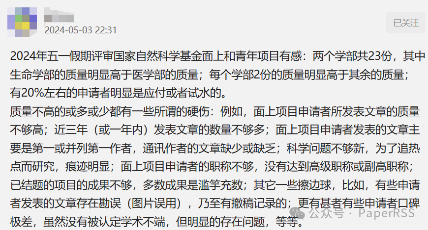 “2024年五一假期评审国家自然科学基金面上和青年项目有感:两个学部共23份,其中生命学部的质量明显高于医学部的质量;每个学部2份的质量明显高于其余的质量;