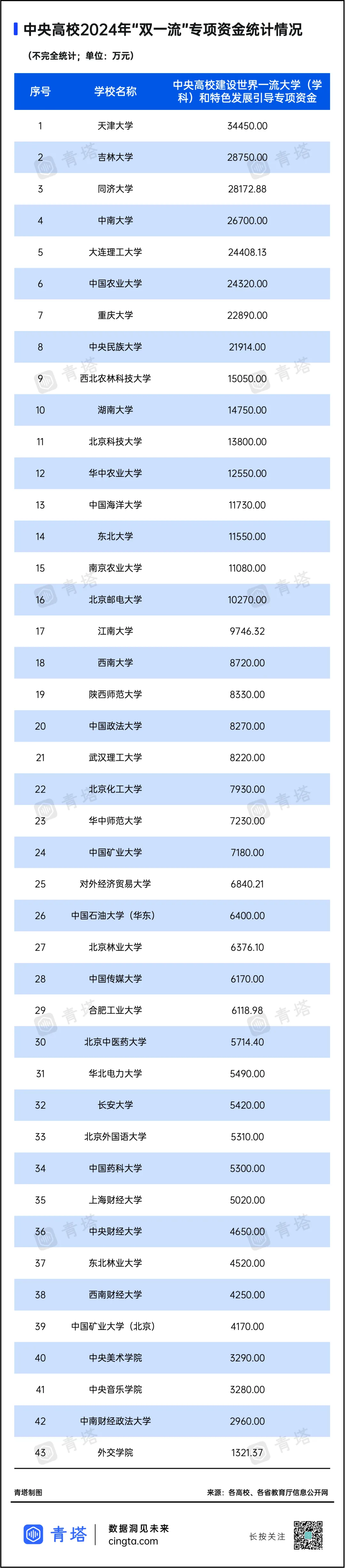 截至目前,青塔团队共采集到了43所中央高校的“双一流”建设专项资金数据,其中有8所高校的“引导专项”预算超过2亿元,7所高校专项经费超1亿。