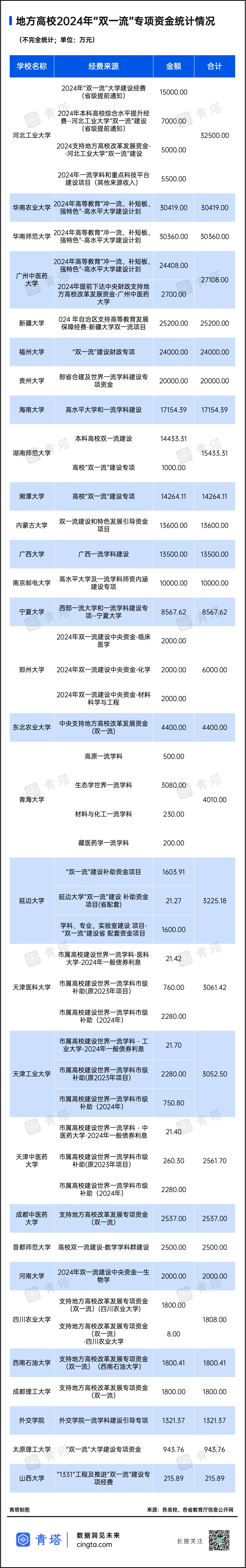 各地方高校的2024年“双一流”专项资金具体如下:(部分高校预算公开表中未涉及“双一流”建设专项资金,故未纳入统计;因各省统计口径不一,本文将包含“一流大学”、“一流学科”或“双一流”等字样的建设资金列入,数据仅供参考;单位:万元;不完全统计)