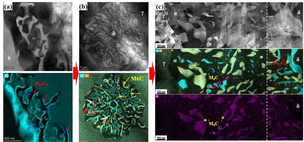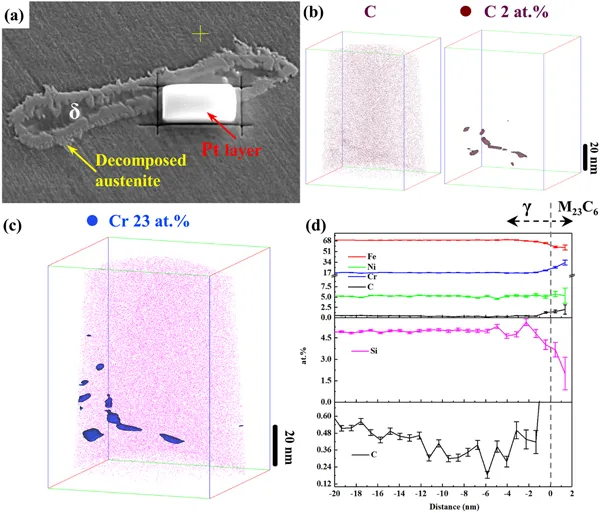 近期,中国科学院金属研究所特种合金研究部在前期高温δ铁素体演变行为对奥氏体不锈钢力学性能和腐蚀性能影响研究的基础上(Metall. Mater. Trans. A,51 (2020) 2998; J. Mater. Sci. Technol.,114 (2022) 7;Mater. Charact.,211 (2024) 113930),进一步揭示了服役温度下新型硅增强奥氏体不锈钢中高温δ铁素体分解的新机制。与传统奥氏体不锈钢中高温δ铁素体快速分解的现象不同,硅增强奥氏体不锈钢中高温δ铁素体分解被抑制,取而代之的是诱发了相邻奥氏体的分解(图1)。首先,二次M23C6碳化物的优先形成在消耗C含量的同时,会将Si排斥至周围奥氏体,诱导富Si贫C微区内奥氏体向α铁素体的转变(图2)。其次,二次M23C6碳化物粗化过程导致Ni和Si原子被逐渐排斥至M23C6/γ和M23C6/α界面,Ni和Si之间的强烈吸引作用,促进了M6C碳化物和G相的析出(图3)。随着奥氏体分解的进行,M6C/α界面上较高的应变不相容导致脆性解理断裂,显著降低合金冲击韧性。这一新机制的澄清为耐强腐蚀介质的长寿命奥氏体不锈钢研制提供了理论基础。相关结果以“Austenite decomposition behavior adjacent to δ-ferrite in a Si-modified Fe-Cr-Ni austenitic stainless steel during thermal aging at 550 °C”为题发表于Acta Materialia 272 (2024) 119948。博士生谢昂为第一作者,陈胜虎研究员和戎利建研究员为共同通讯作者。该研究工作得到了国家自然科学基金、中核集团领创科研项目和中核集团青年英才项目的资助。图2. 高温δ铁素体周围M23C6优先形成导致富Si贫C微区的形成图3. M23C6粗化排斥Ni和Si原子诱导 M6C的析出