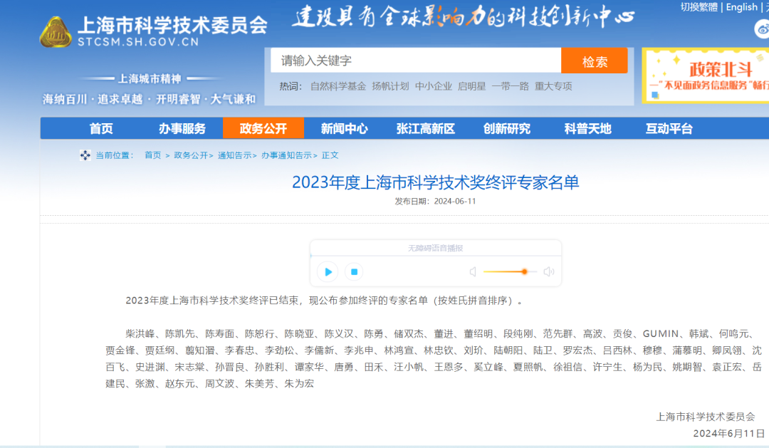2023年度上海市科学技术奖终评已结束,现公布参加终评的专家名单(按姓氏拼音排序)。