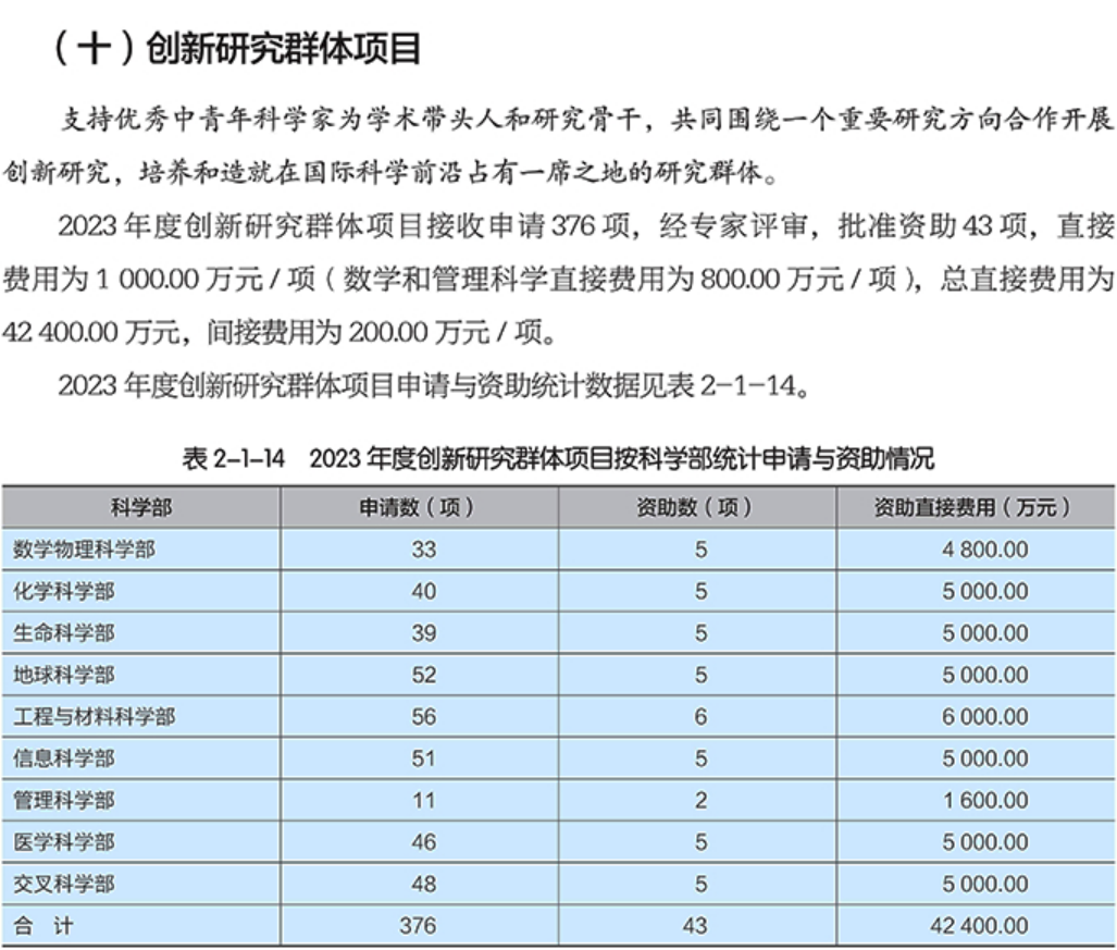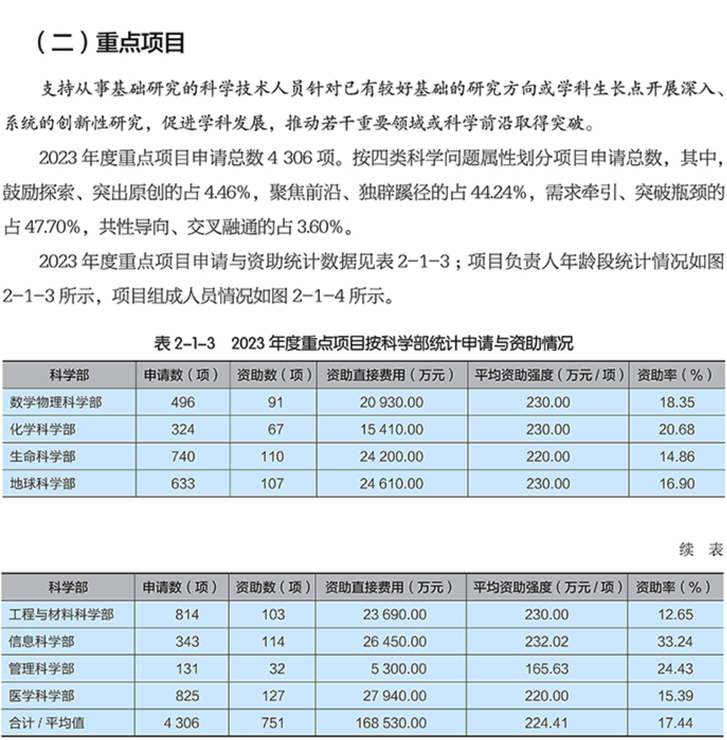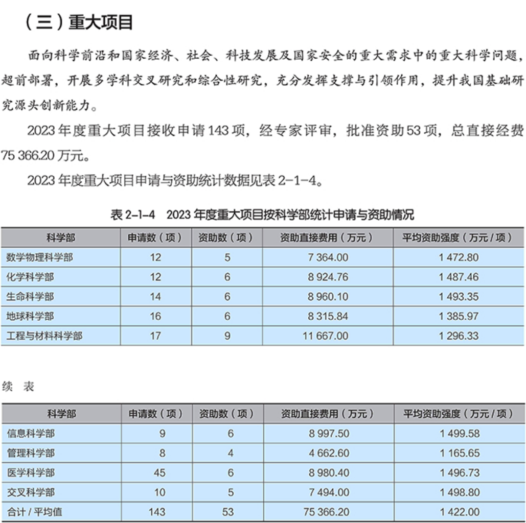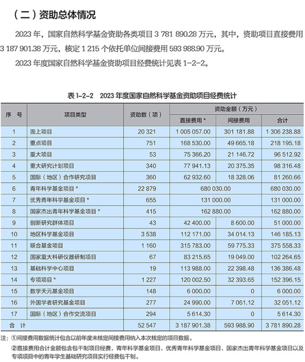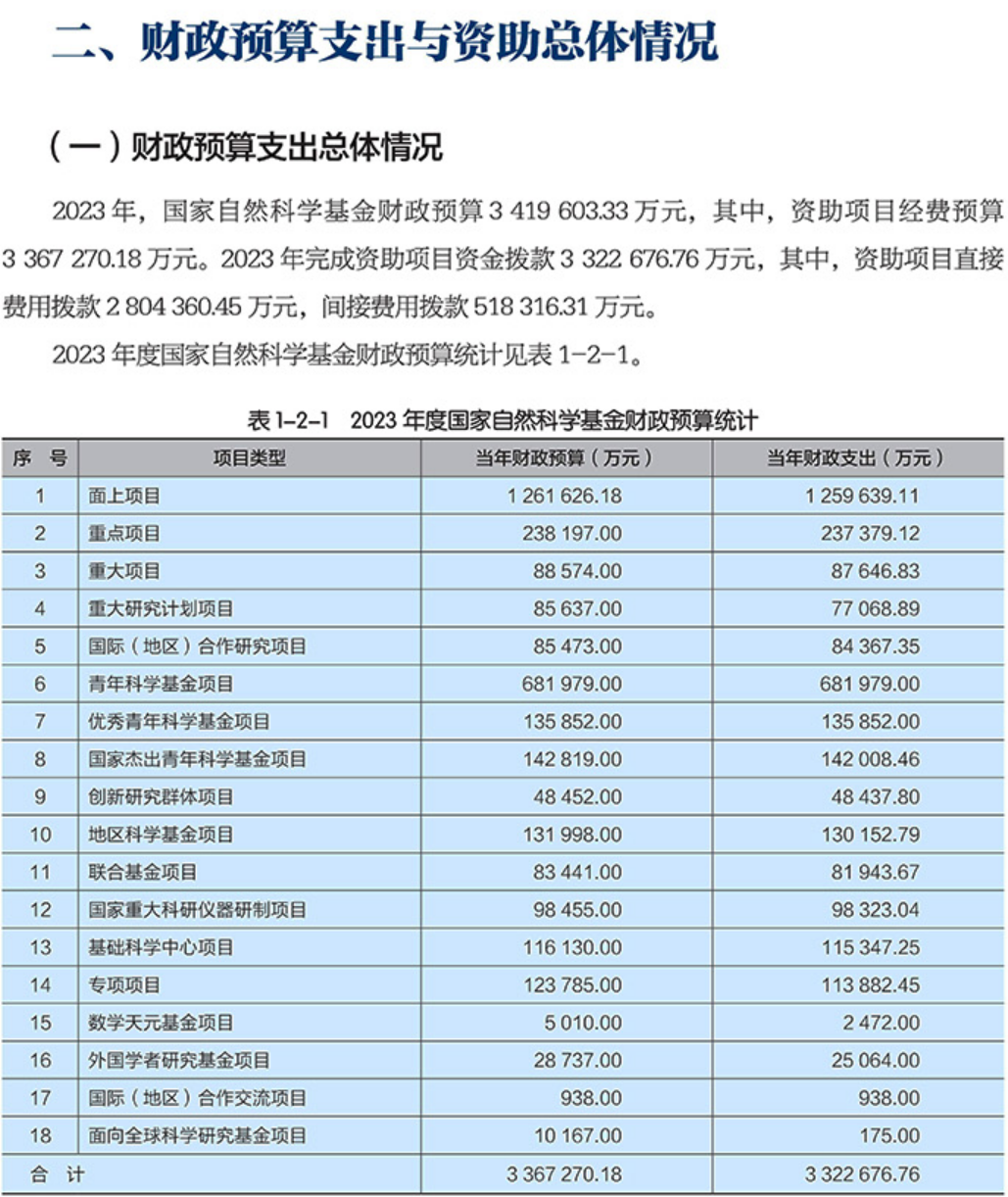 6月14日,国家自然科学基金委发布《2023年度报告》,报告显示,2023年,国家自然科学基金财政预算3419603.33万元,其中,资助项目经费预算3367270.18万元。2023年完成资助项目资金拨款3322676.76万元,其中,资助项目直接费用拨款2804360.45万元,间接费用拨款518316.31万元。2023年,国家自然科学基金资助各类项目3781890.28万元,其中,资助项目直接费用3187901.38万元,核定1215个依托单位间接费用593988.90万元。