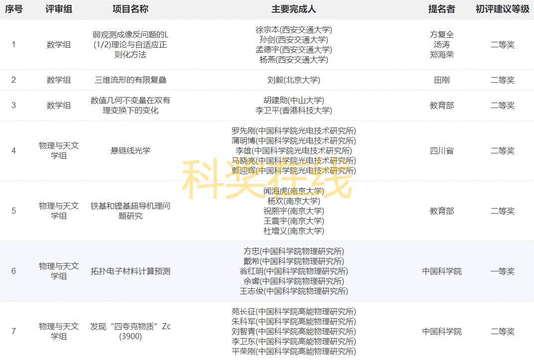 2023年度国家科学技术奖初评工作已经结束。现将初评通过的59项国家自然科学奖项目、52项国家技术发明奖通用项目、132项国家科学技术进步奖通用项目,在国家科技管理信息系统公共服务平台公布。初评通过的19项国家技术发明奖专用项目和39项国家科学技术进步奖专用项目在委托管理单位、提名单位及项目完成单位等进行内部公布。