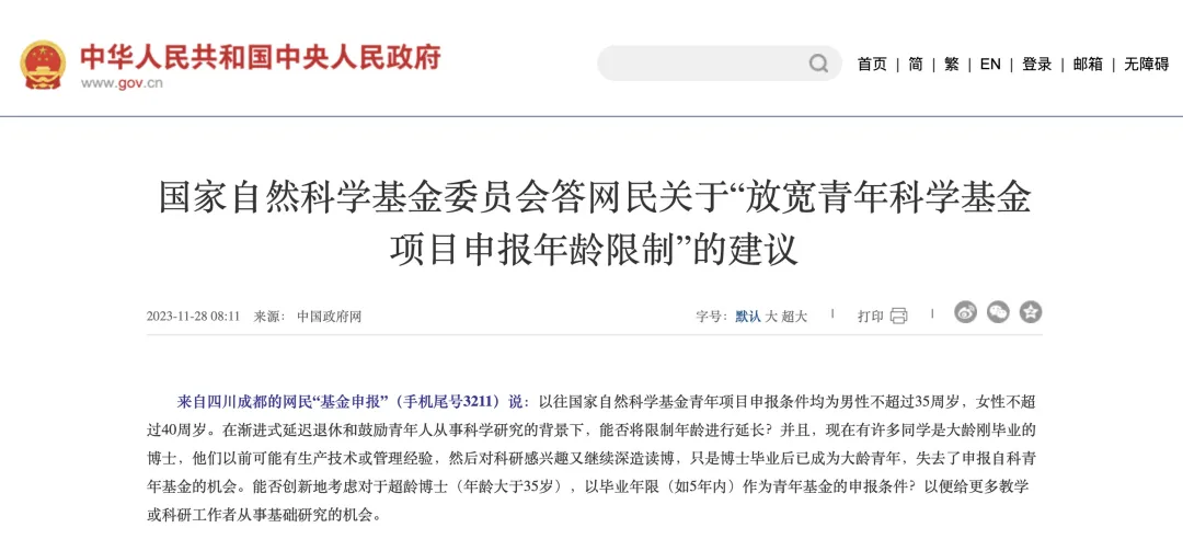 网民建议放宽“青年基金项目”申报的35周岁年龄限制,国自然基金委这样回应