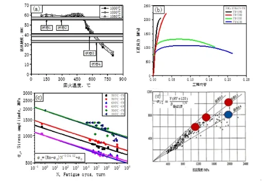 图7 高氮高强马氏体不锈钢基体与表面热处理对性能影响研究.(a)X30一材四状态工艺性能图,(b)X30一材四状态的拉伸曲线,(c)X30一材四状态旋弯疲劳性能和(d)X30钢表面渗氮硬度和耐温性能