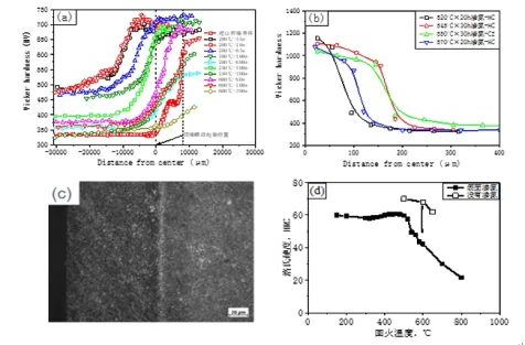 图8 高氮高强马氏体不锈钢表面超硬化技术研究结果。(a)表面感应淬火硬度分布,(b)表面渗氮热处理硬度分布,(c)表面渗氮层深度可达0.1mm以上和(d)表面渗氮大幅提高耐温性能。