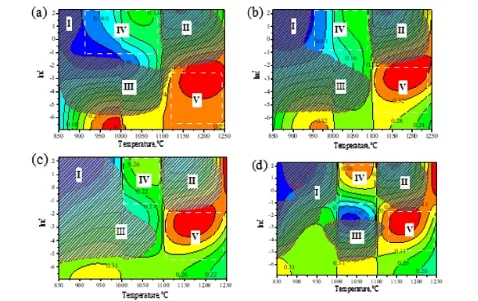 图5 不同应变量下轴承钢Cronidur30钢热加工图工艺谱(a)0.1,(b)0.2,(c)0.4和(d)0.6 (高温1100-1250℃的低速变形(10-5-10-2/s)和低温1000-1100℃的高速变形(10-1-10+2/s))