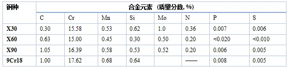 表1 X30、X60、X90及440C钢化学成分(感应加压冶炼,440C双真空冶炼)