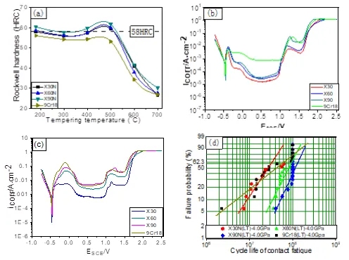 图2 系列化高氮高强马氏体不锈钢的性能验证 (a)回火温度对硬度影响, (b)180℃回火耐蚀性能比较,(c)500℃回火耐蚀性能比较和(d)180℃回火接触疲劳性能比较