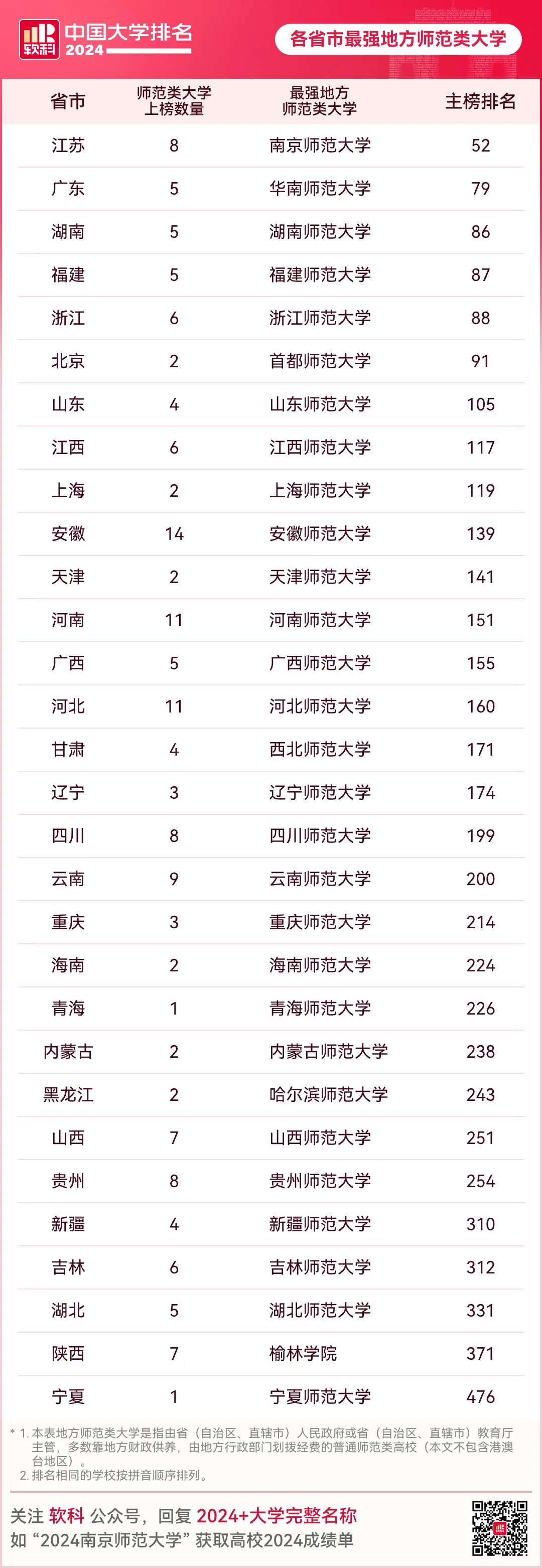 地方师范高校,是我国教育发展不可动摇的根基。从全国教师教育的格局和基础教育师资来源看,地方师范院校既是教师教育的关键主体,也是基础教育教师的主要孵化场。从2024软科中国大学排名中,我们也可一窥地方师范类大学的实力。