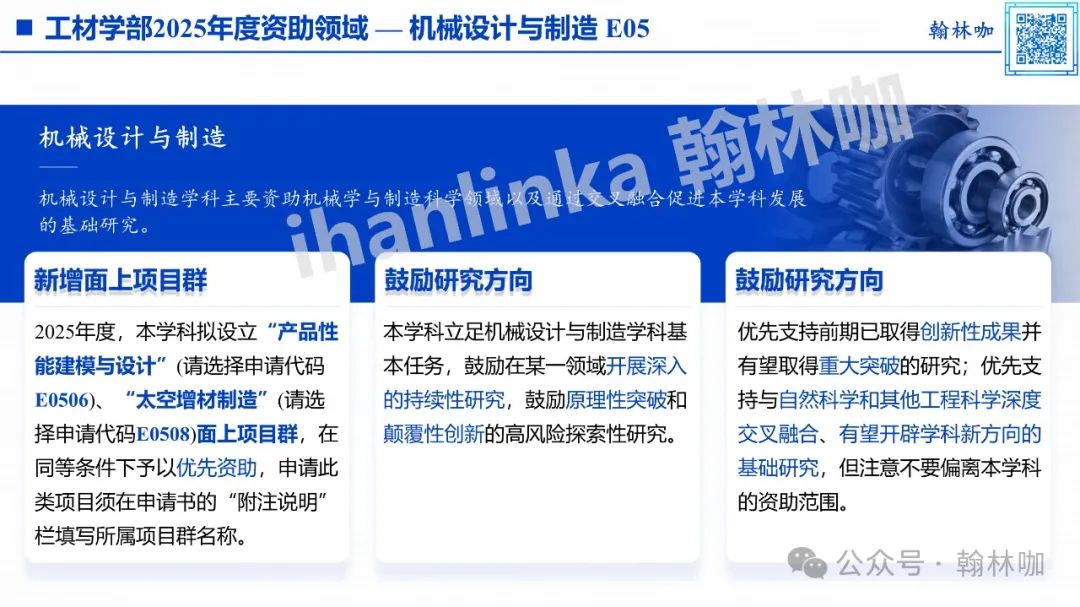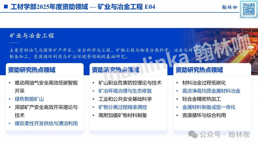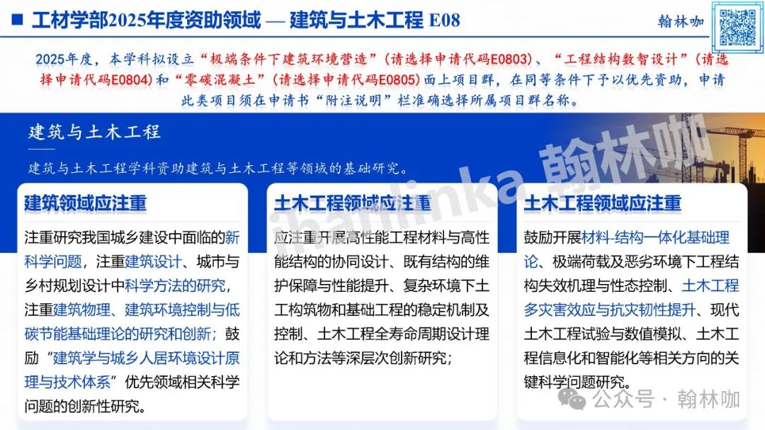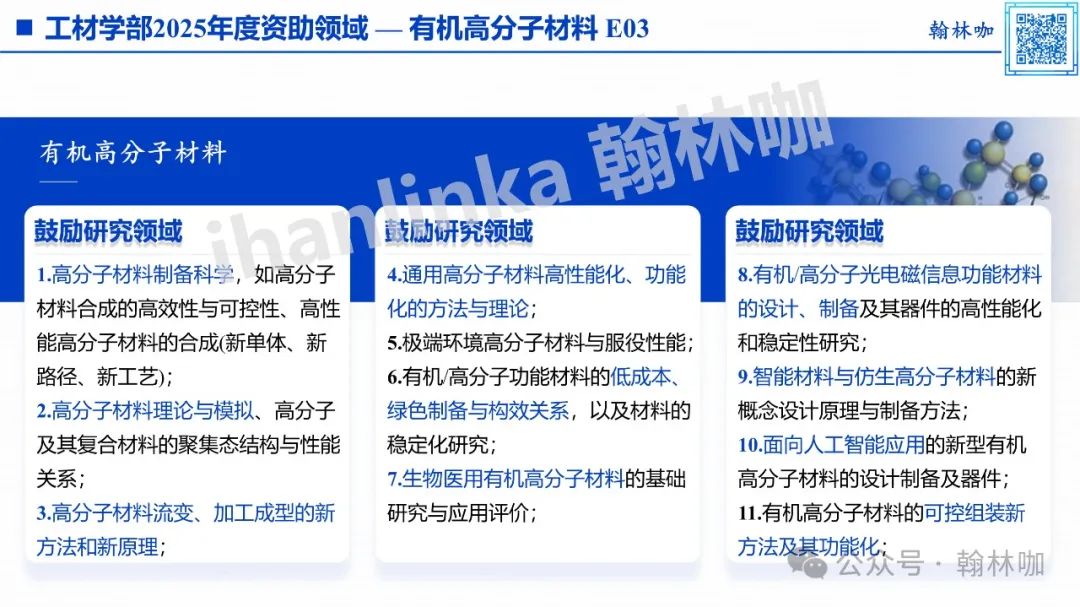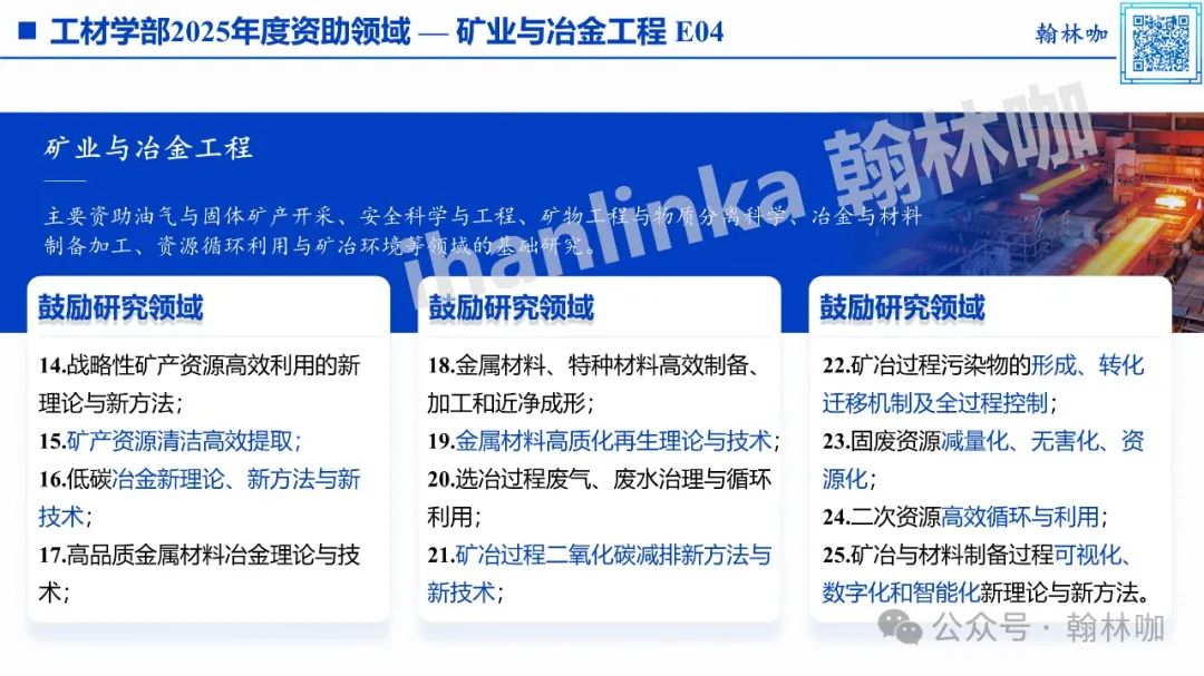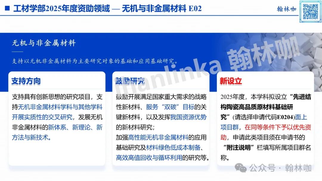 日前,2025年度国家自然科学基金项目指南正式发布。为了帮助广大科研工作者更好地了解各科学部的资助方向与申请要点,提高中标率,翰林咖基于专业视角提炼成直观易懂的PPT,方便申请人快速查阅与参考。下面为工程与材料科学部资助要点: