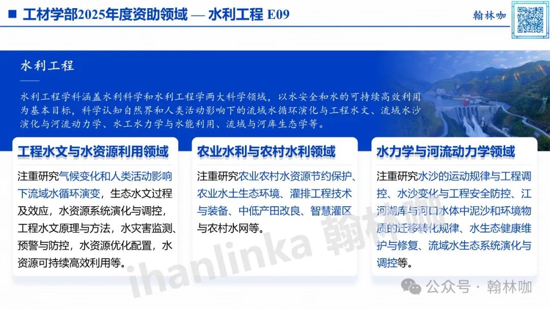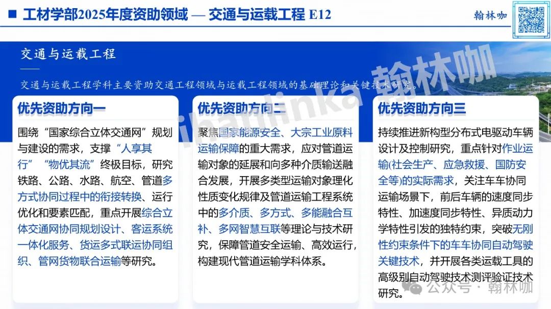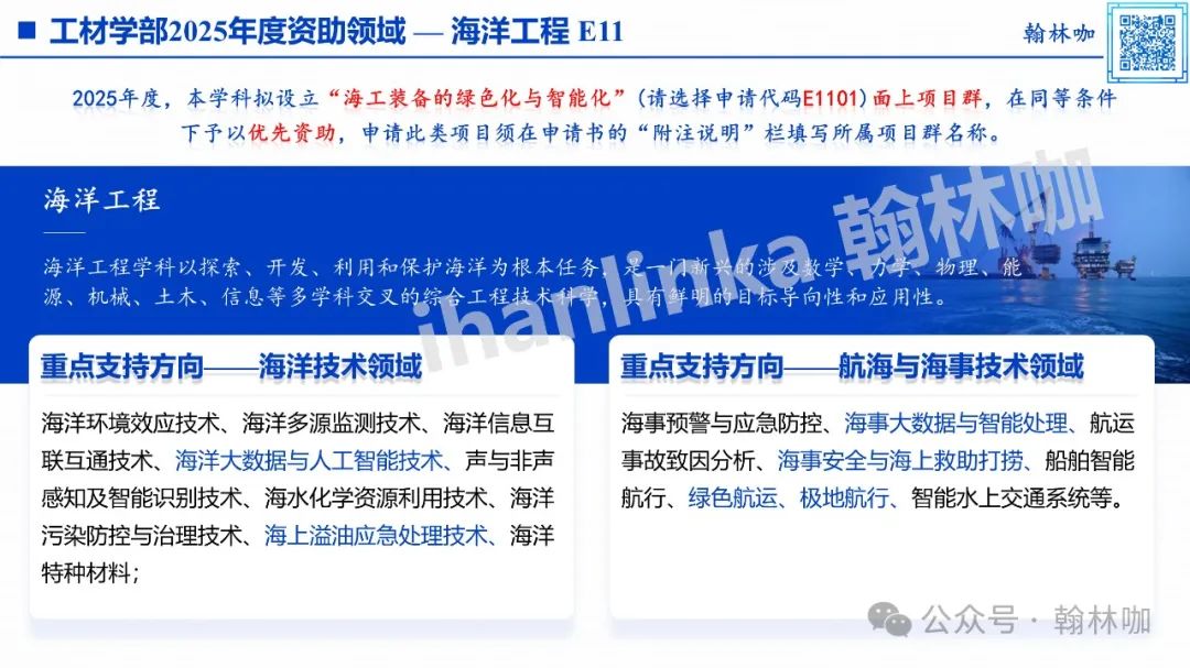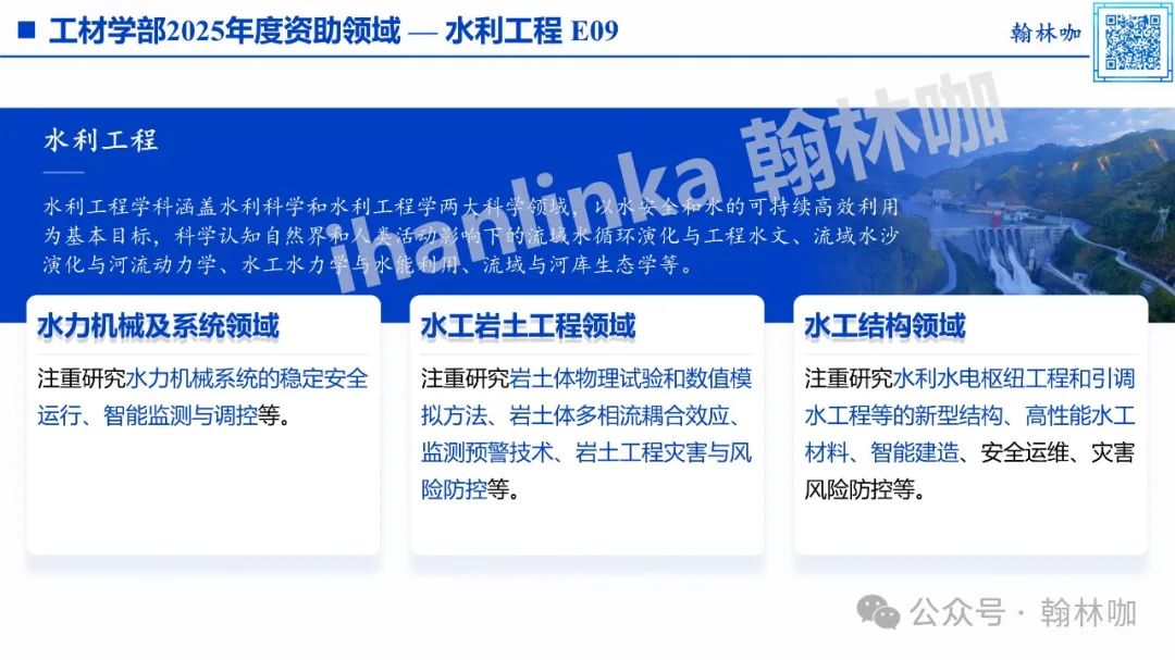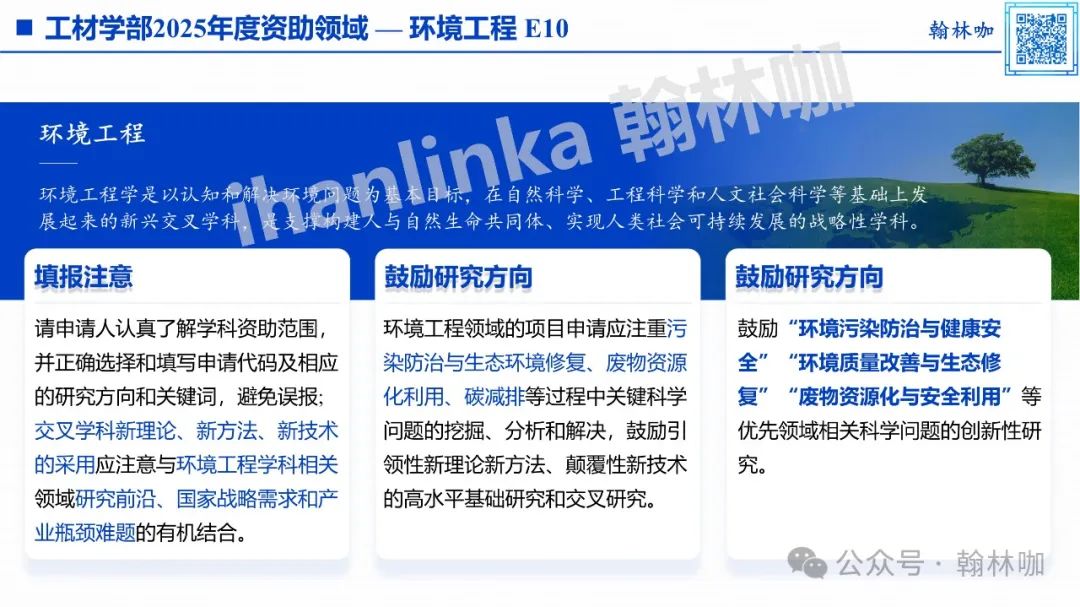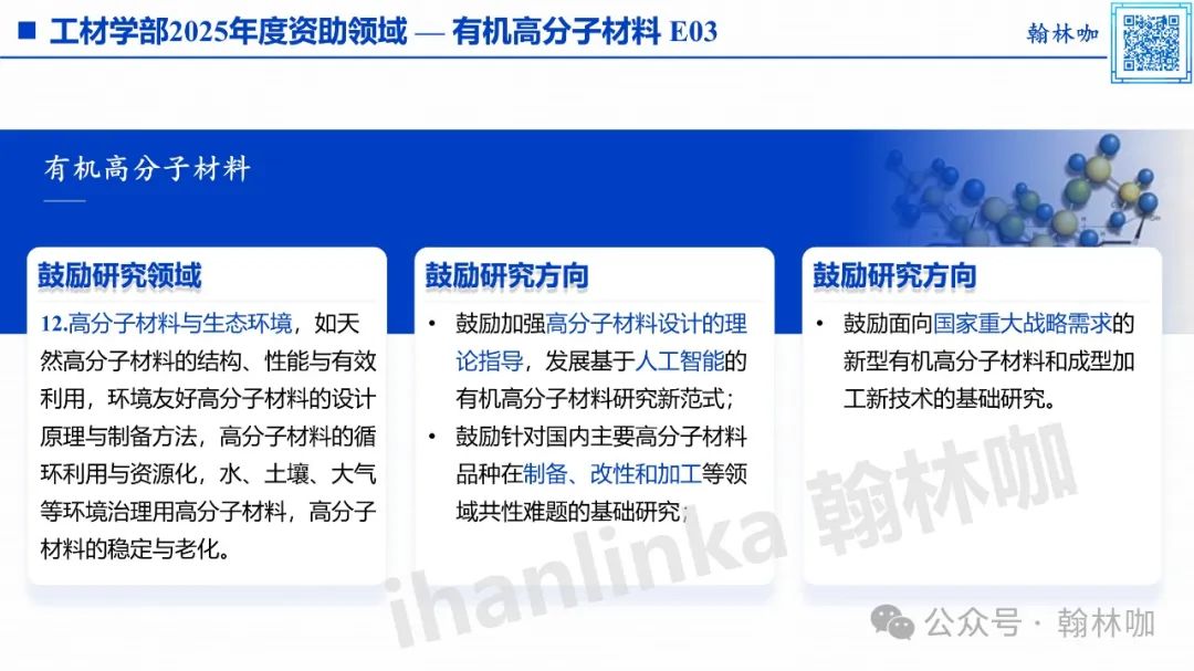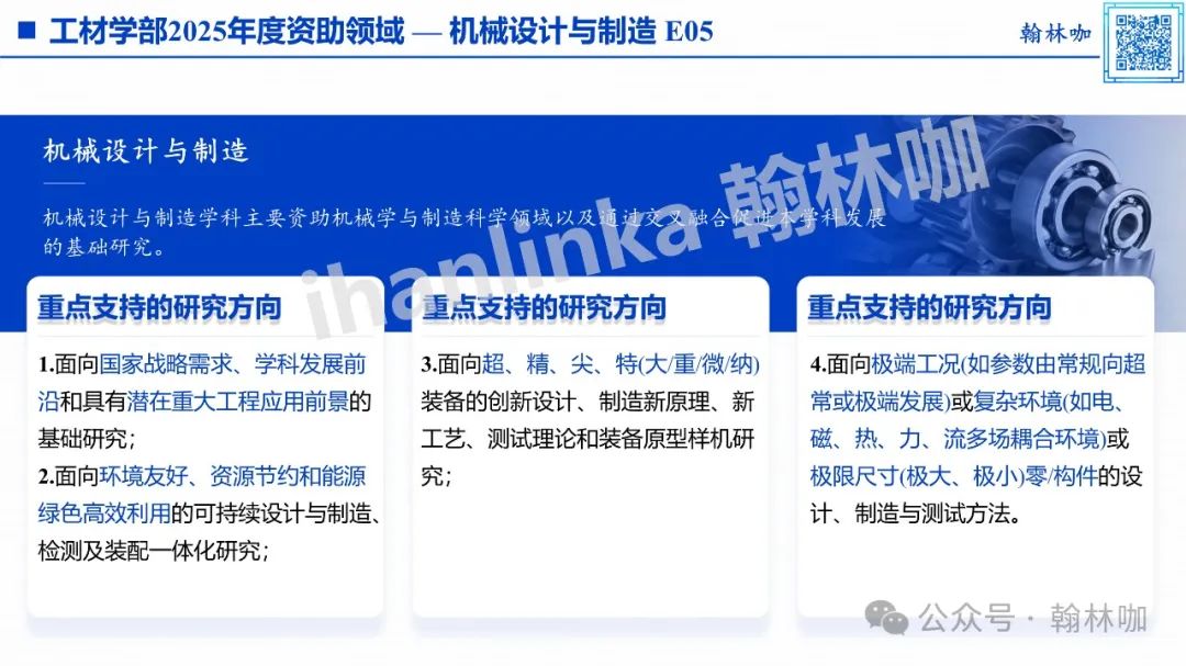日前,2025年度国家自然科学基金项目指南正式发布。为了帮助广大科研工作者更好地了解各科学部的资助方向与申请要点,提高中标率,翰林咖基于专业视角提炼成直观易懂的PPT,方便申请人快速查阅与参考。下面为工程与材料科学部资助要点: