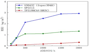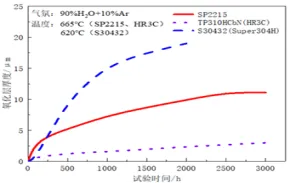 模拟烟气气氛(15%CO2+3.5%O2+1.0%SO2)测试合金抗烟气腐蚀能力,SP2215的腐蚀增重速率较小,抗腐蚀性能介于HR3C和Super304H合金之间。