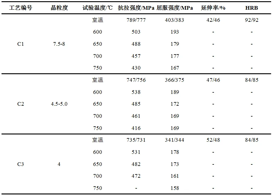 (5)建立适用于SP2215合金的热处理制度,实现对管材晶粒度和显微组织调控:对成品规格冷轧管进行不同工艺热处理,试验温度1180~1250℃。按温度由低到高,工艺编号依次记为C1~C3。热处理试验结果见表3。