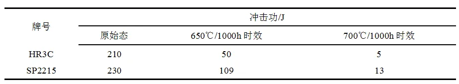 SP2215合金的拉伸性能与HR3C合金相当,在超超临界机组的工作条件下,高出Super304H约15%;高温持久强度分别优于HR3C和Super304H合金分别是20%和10%;其650℃/1000h时效下的合金冲击功是HR3C合金的2倍以上,克服了HR3C合金在高温时效后冲击韧性急速降低的问题。