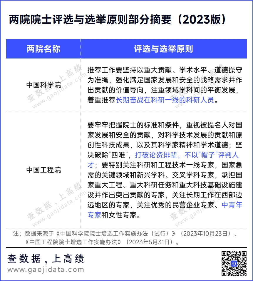 根据2023年最新发布的《中国科学院院士增选工作实施办法(试行)》、《中国工程院院士增选工作实施办法》文件,明确将着重推荐一线科研人员,以及中青年专家。